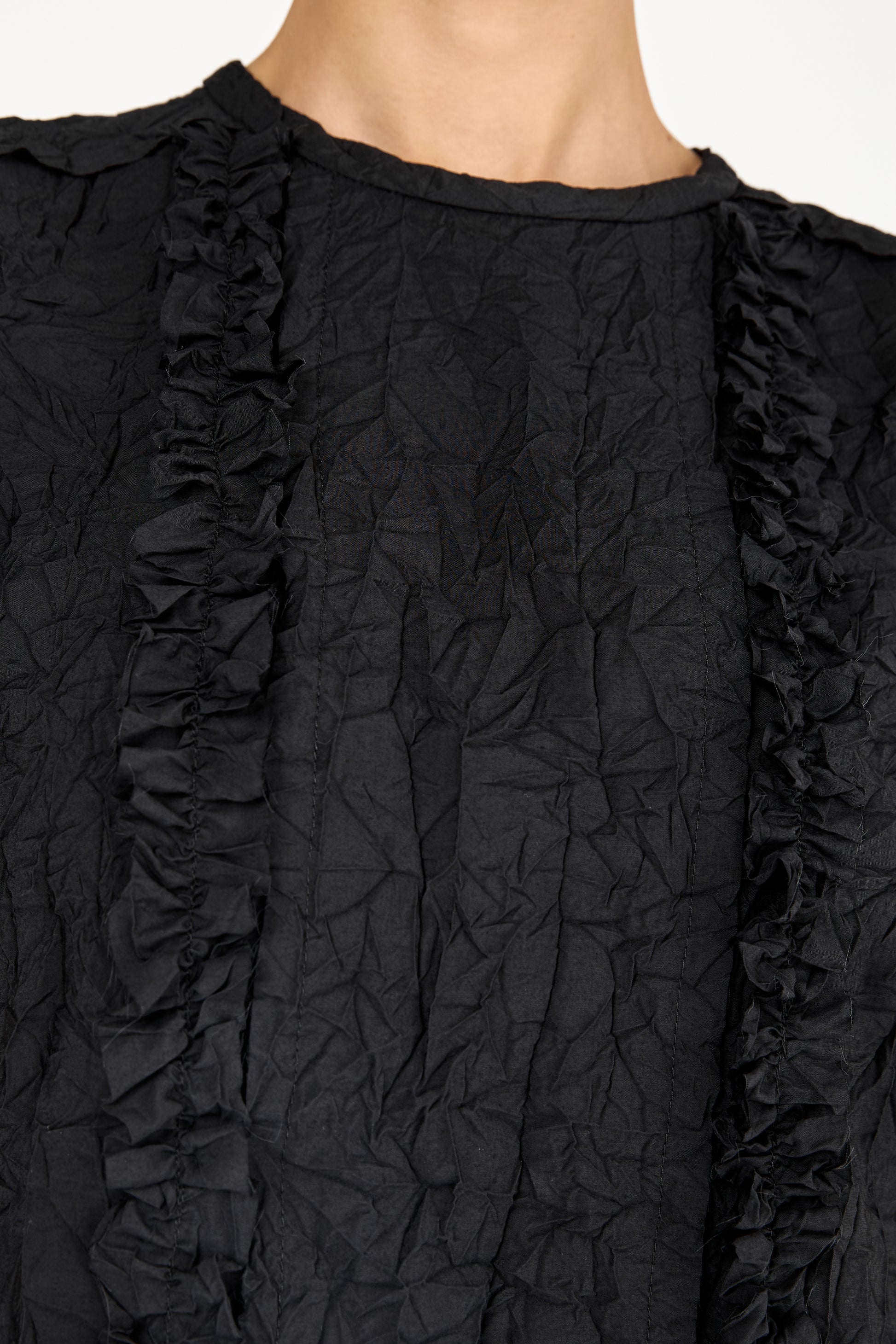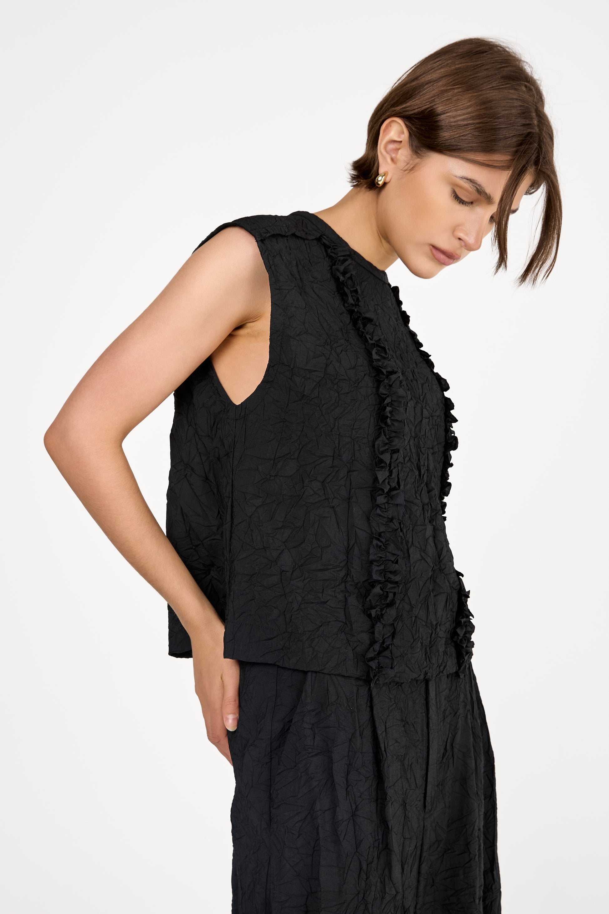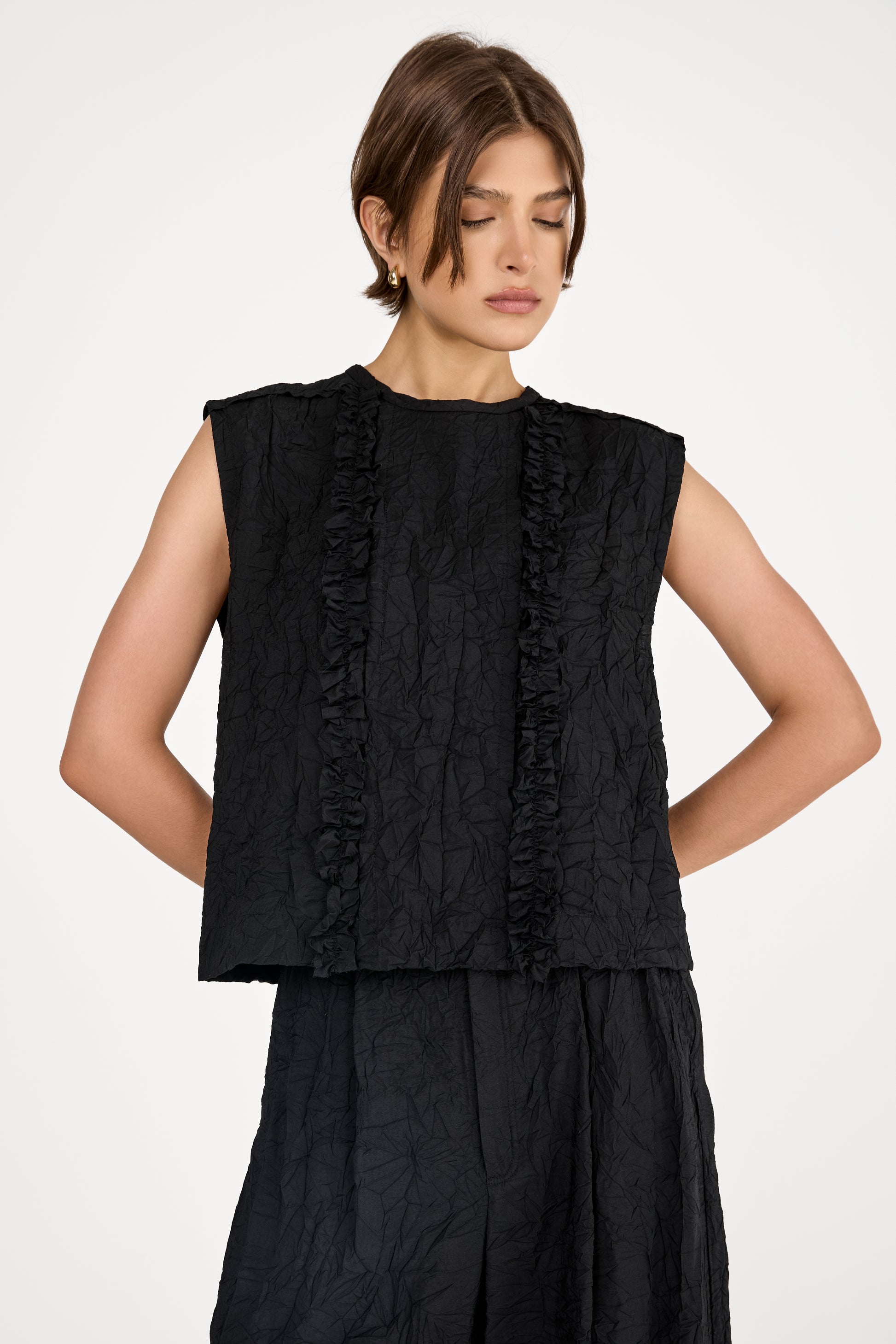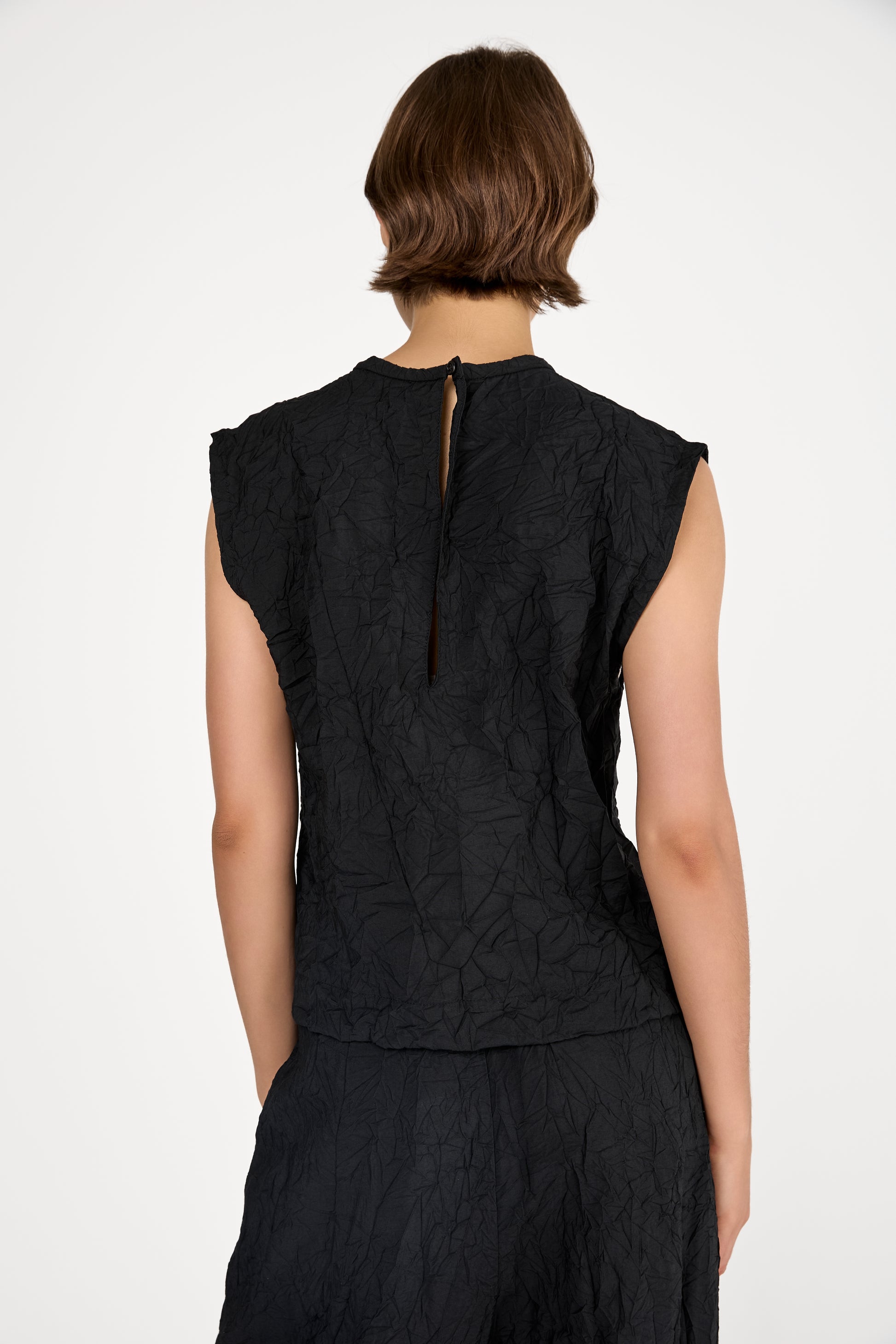 (nude) Sleeveless Crinkled Top in Black. Sleek, minimalist style with a crinkled texture. Featuring a fluid silhouette perfect for layering or wearing solo. Timeless sophistication ideal for both casual and elevated looks.