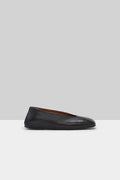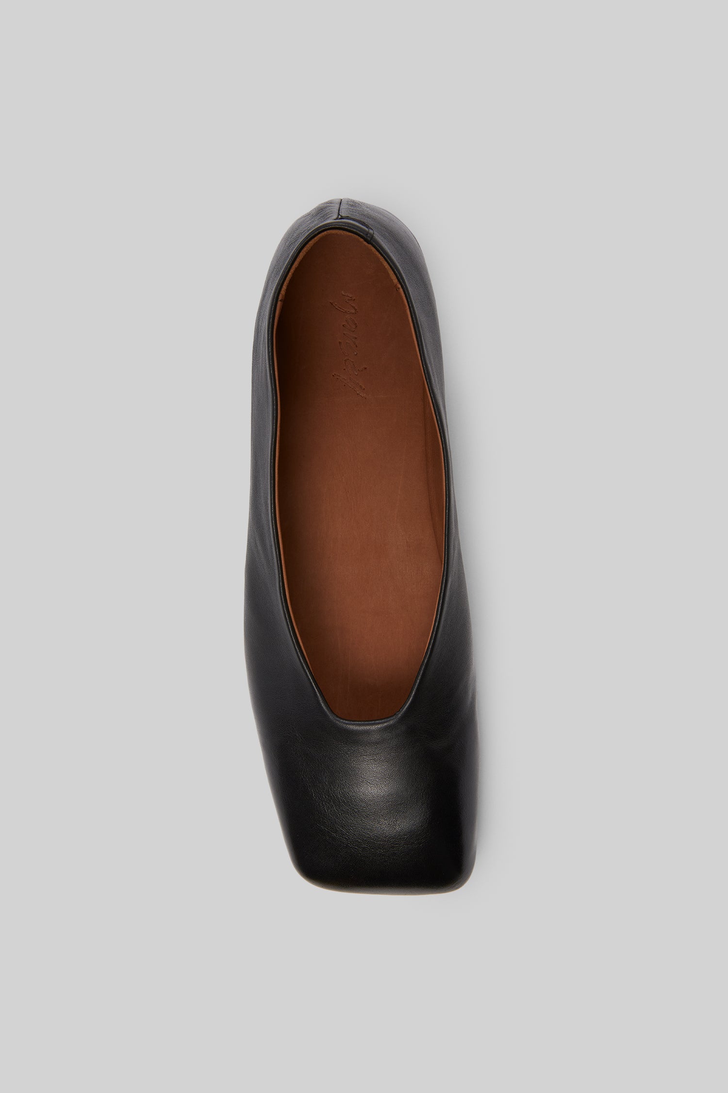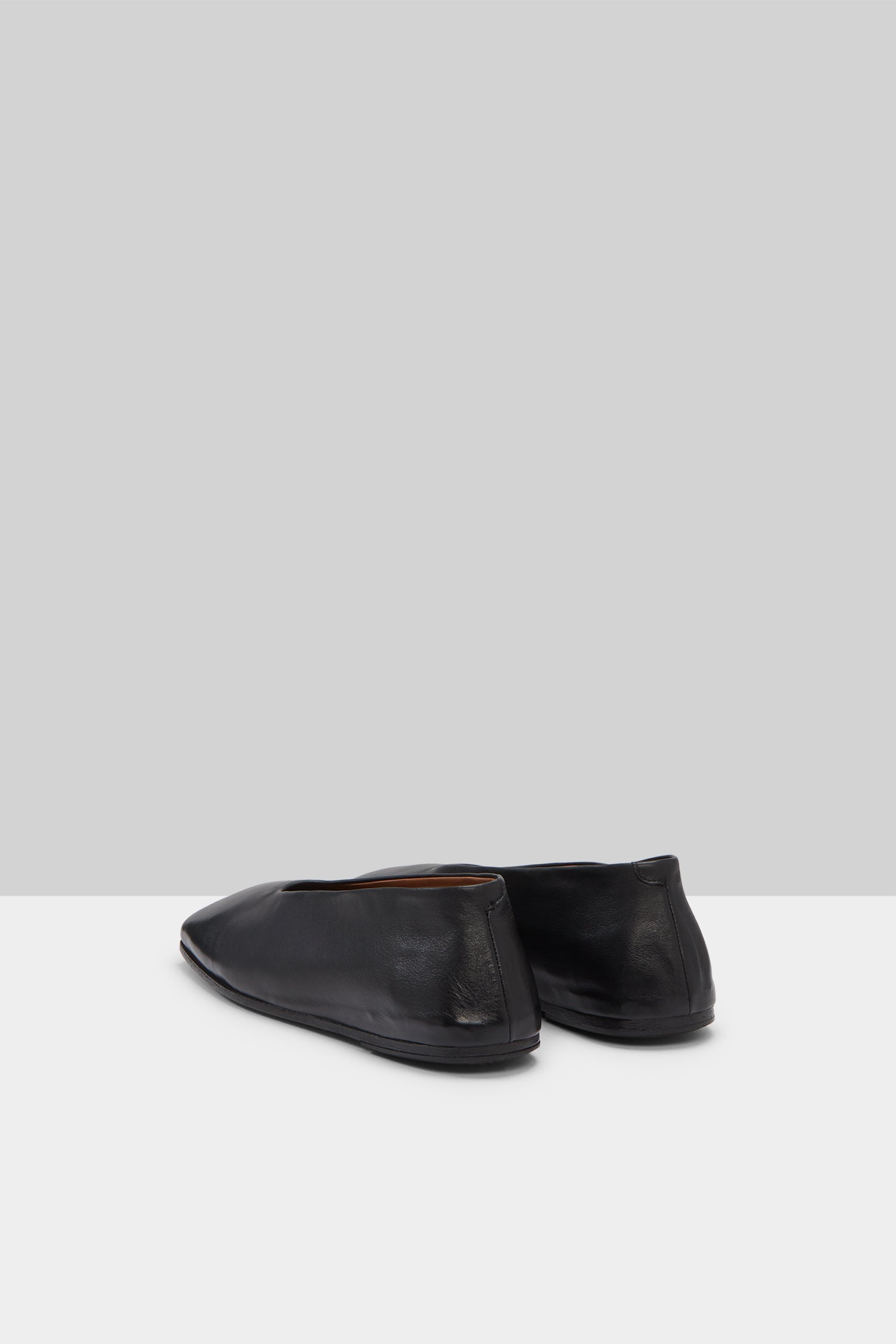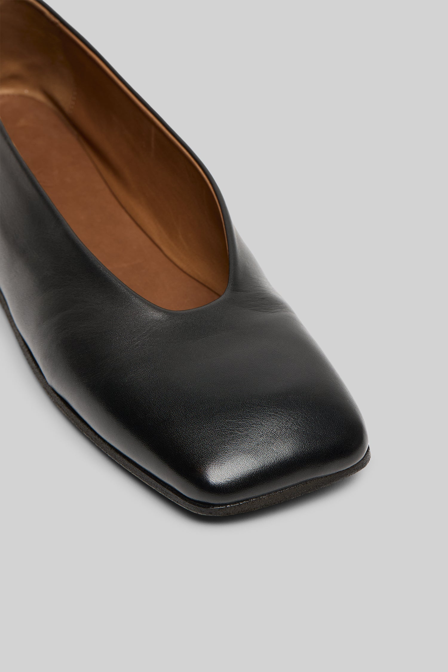 MARSÈLL Spatolona Leather Shoe in Black. Iconic ballerina flats featuring a closed square toe and smooth leather upper. Timeless design handmade with the highest quality materials and traditional handcrafting techniques at the Marsèll Workshop in Veneto, Italy.