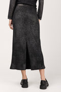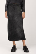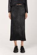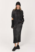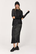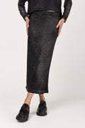 The AVANT TOI Star Dust Effect Ultralight Cashmere Skirt in Nero, crafted in Italy from an ultralight blend of cashmere and wool, exudes effortless elegance. Its fluid drape and elongated silhouette are defined by fine needle stitching, while the delicate star dust effect lends a subtle shimmer that catches the light with every movement.