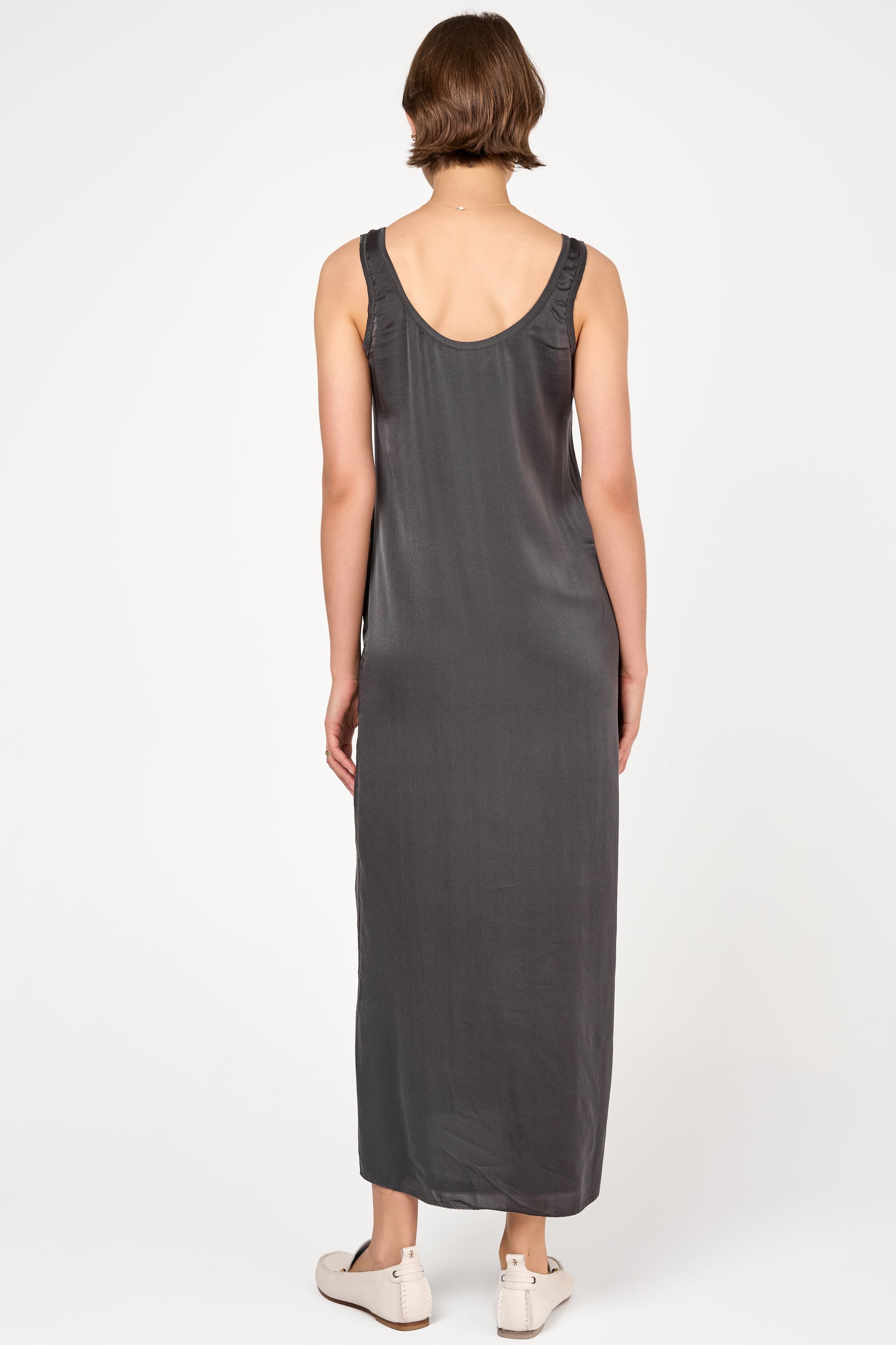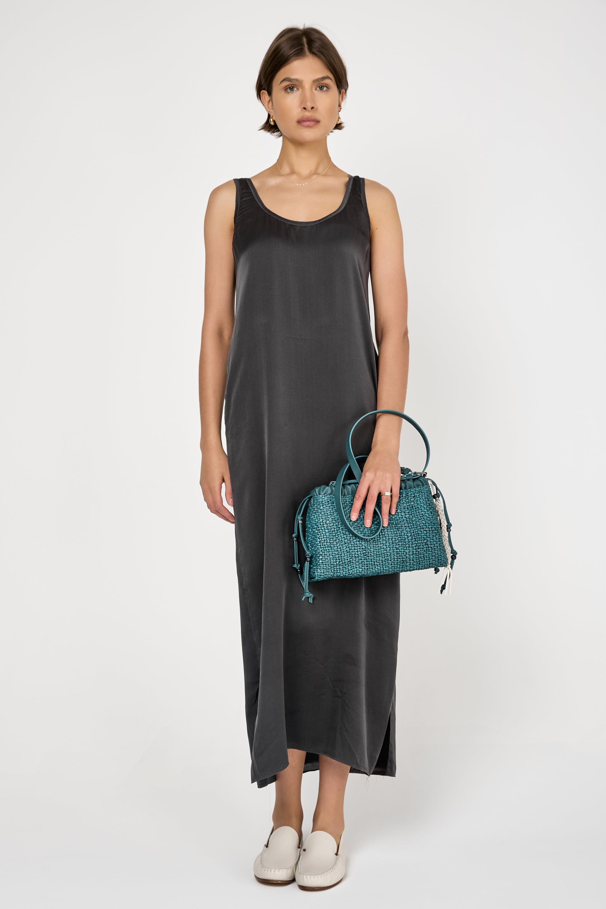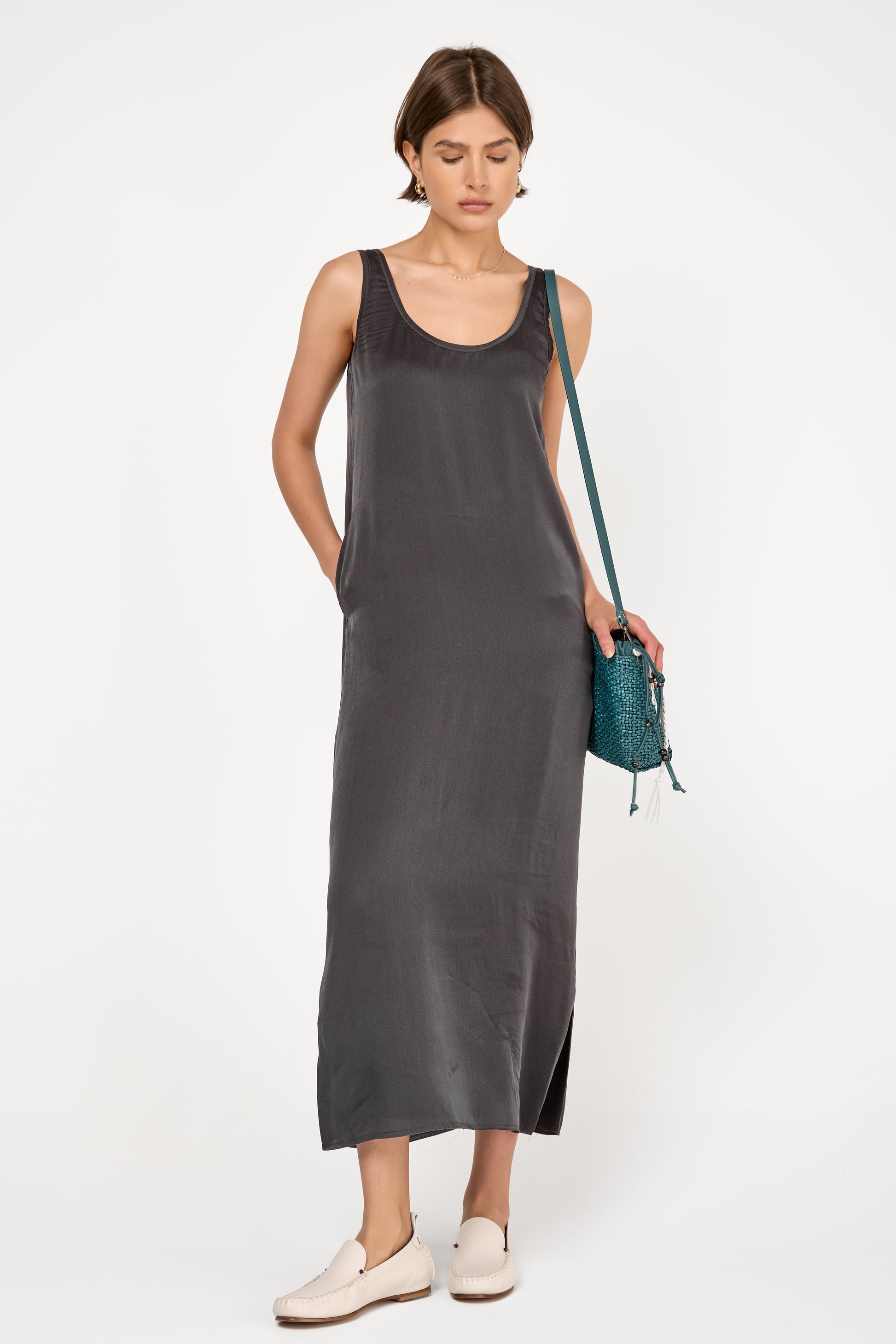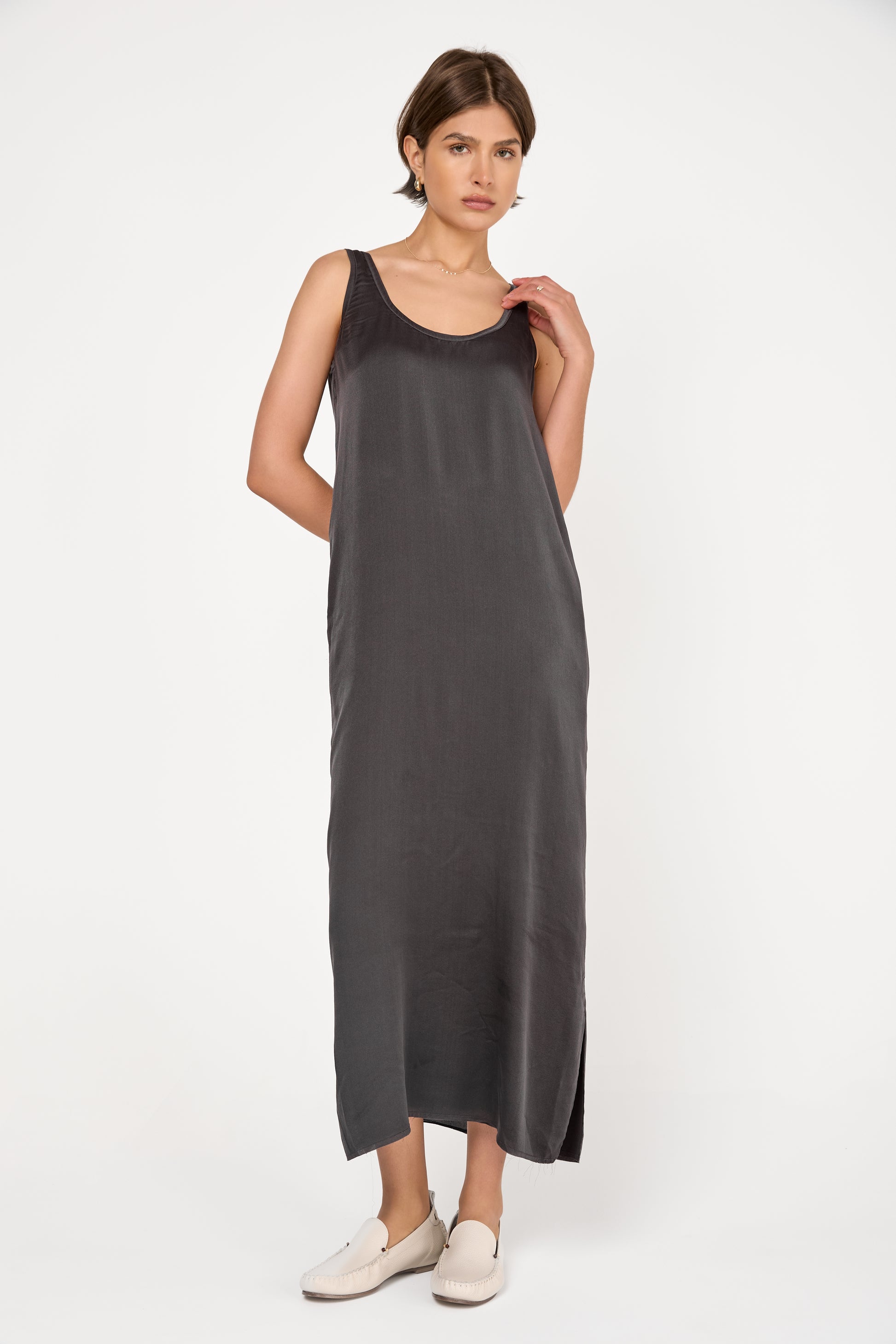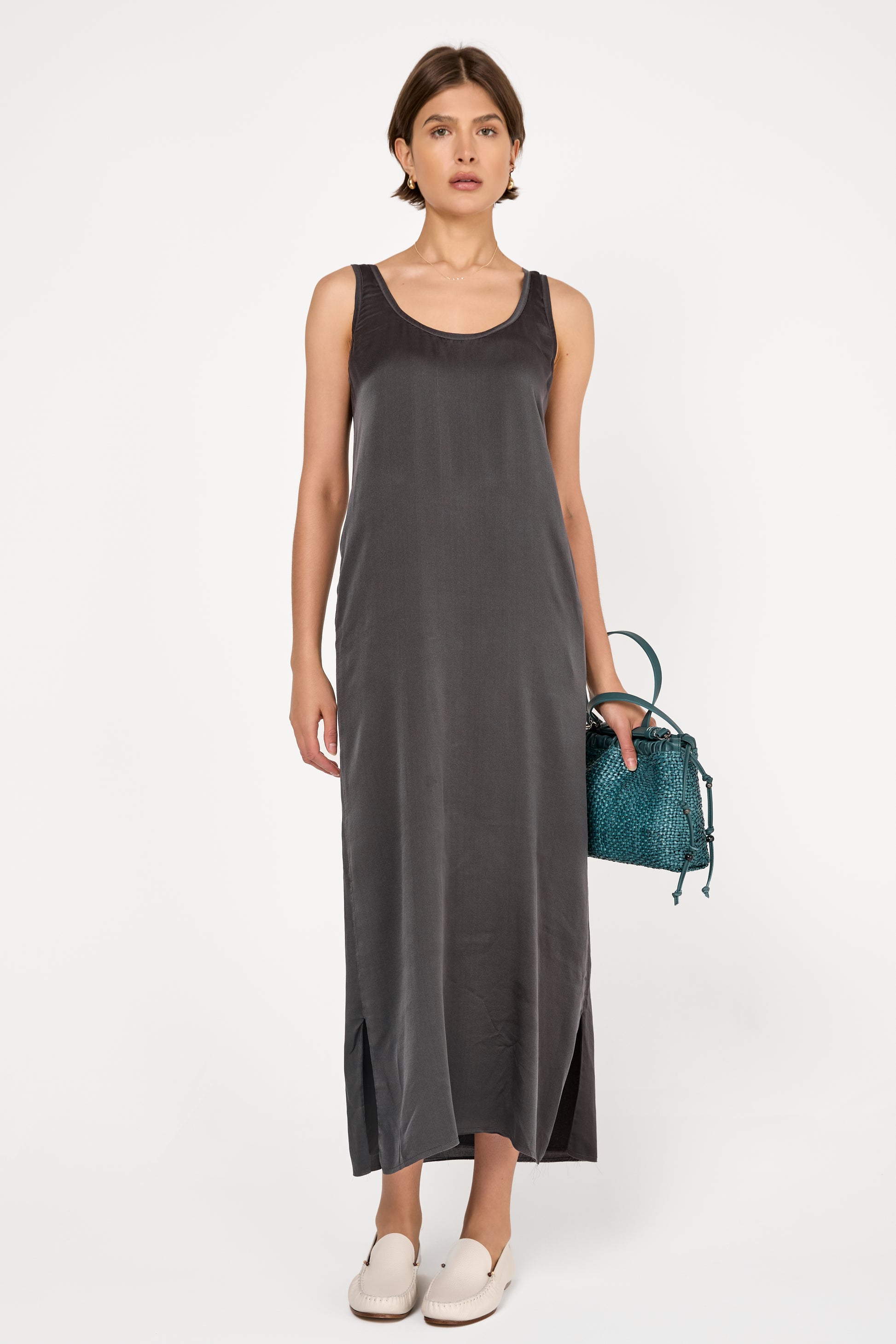 PRIVATE 0204 Summer Silk Dress in Mud. 96% Silk, 4% Elastane. Double layer / silk lining. Made in Italy.
