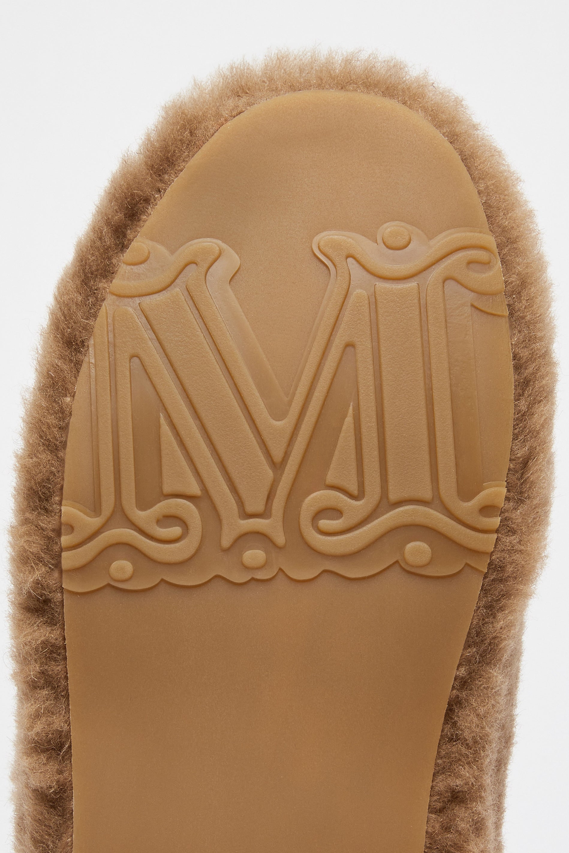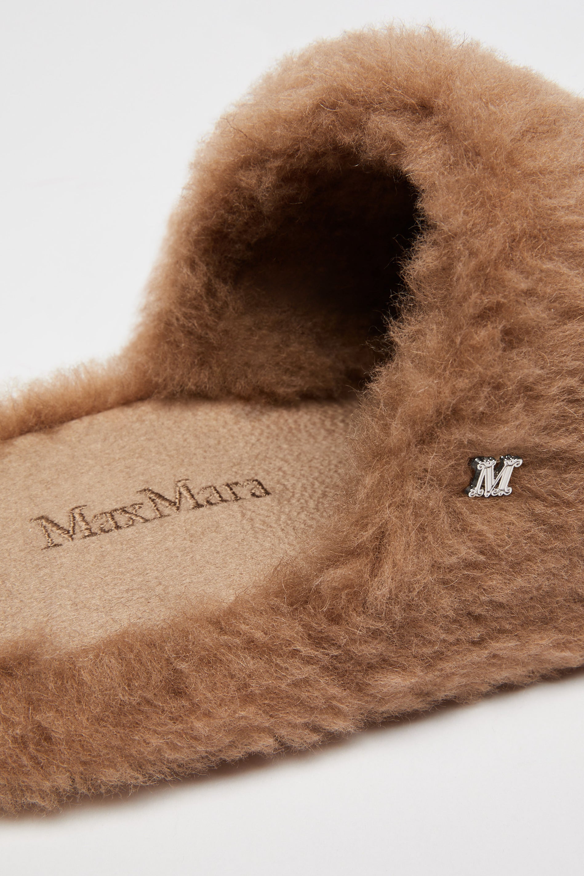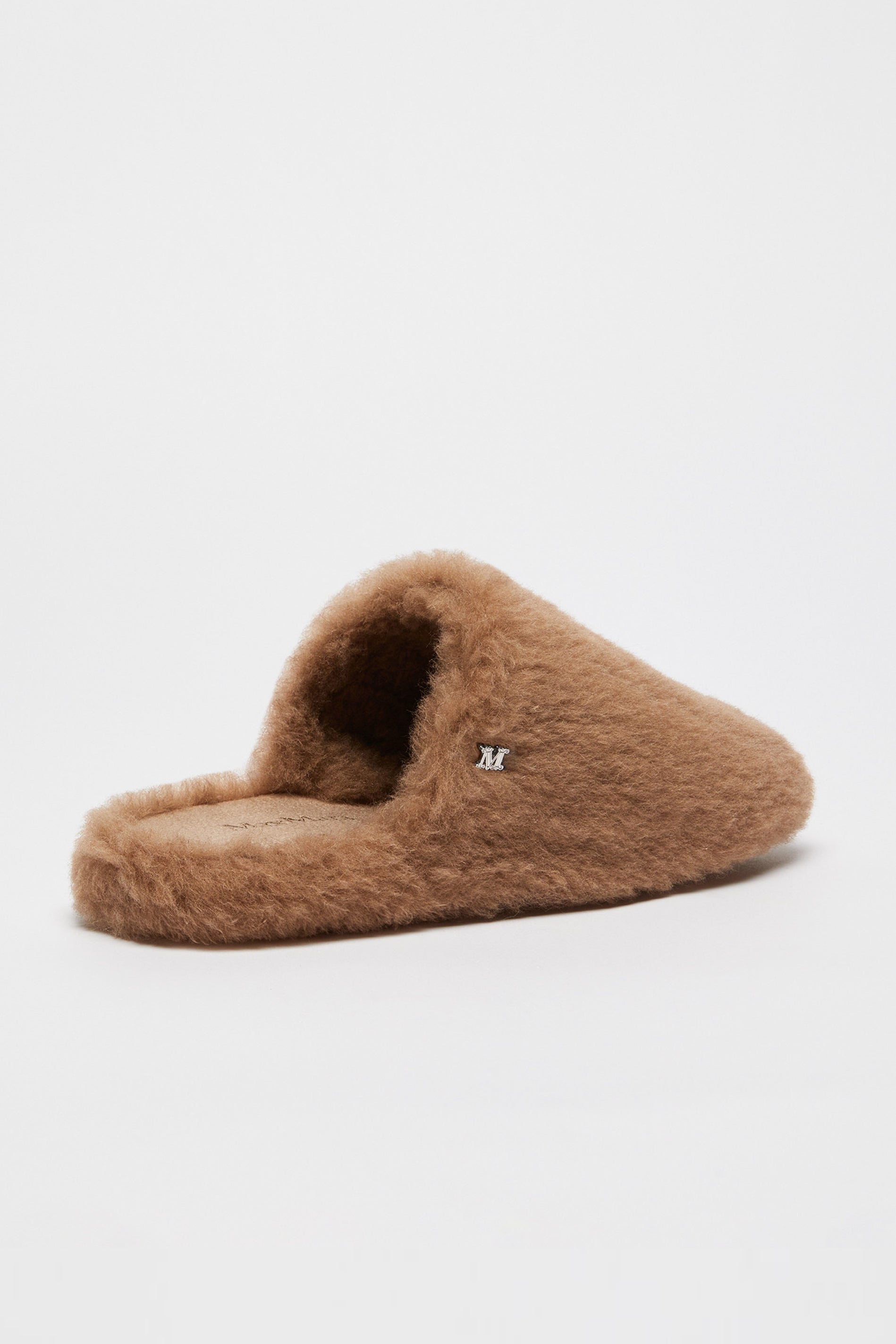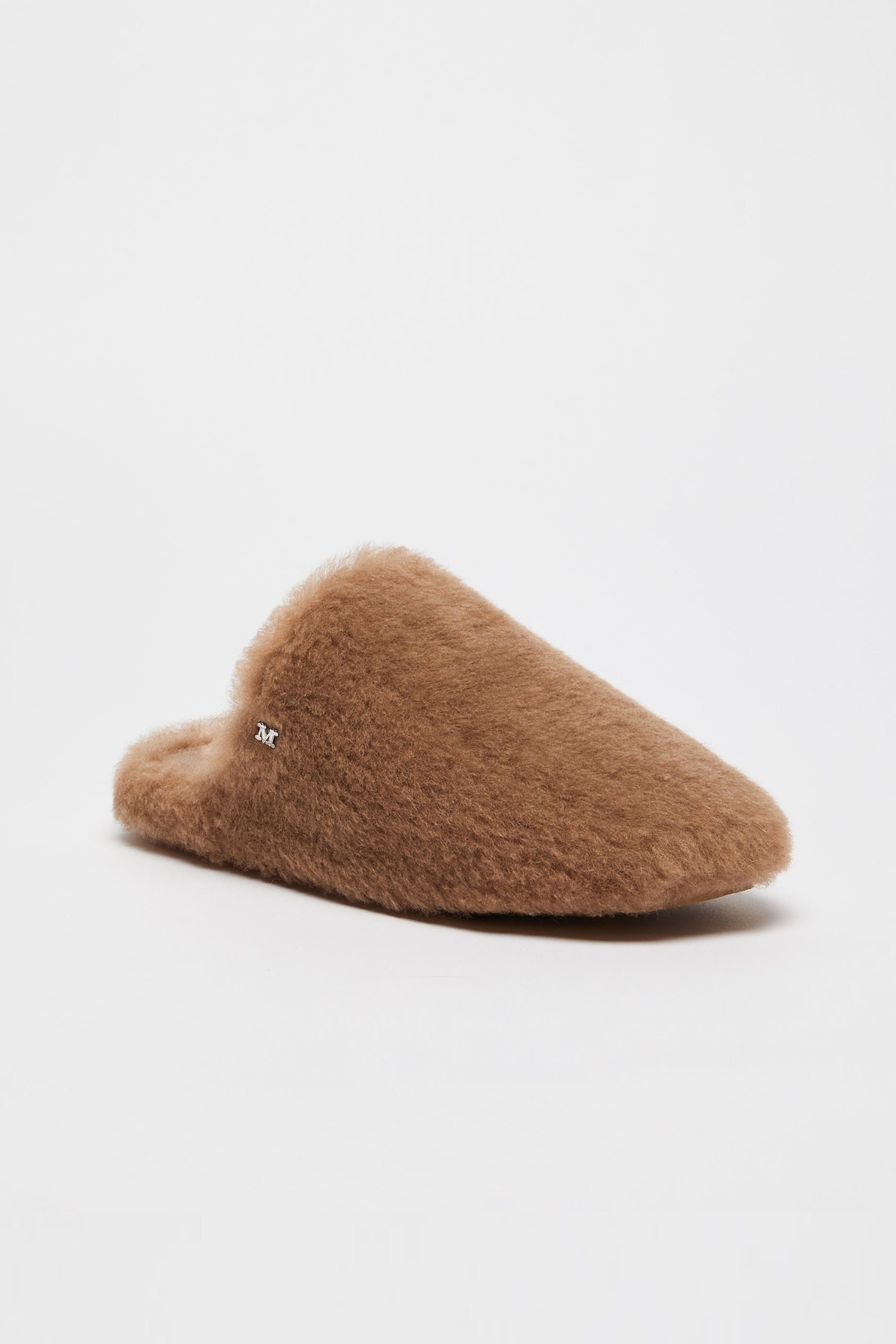 MAX MARA Teddy Slipper Slide in Camel. Extra soft slippers made of iconic camel Teddy fabric on a silk base. Designed for durability and resistance. Featuring a metal micro M brand logo on the side. Finished with a matching interior and a rubber sole with non-slip M MaxMaraGram logo for comfort and flexibility.