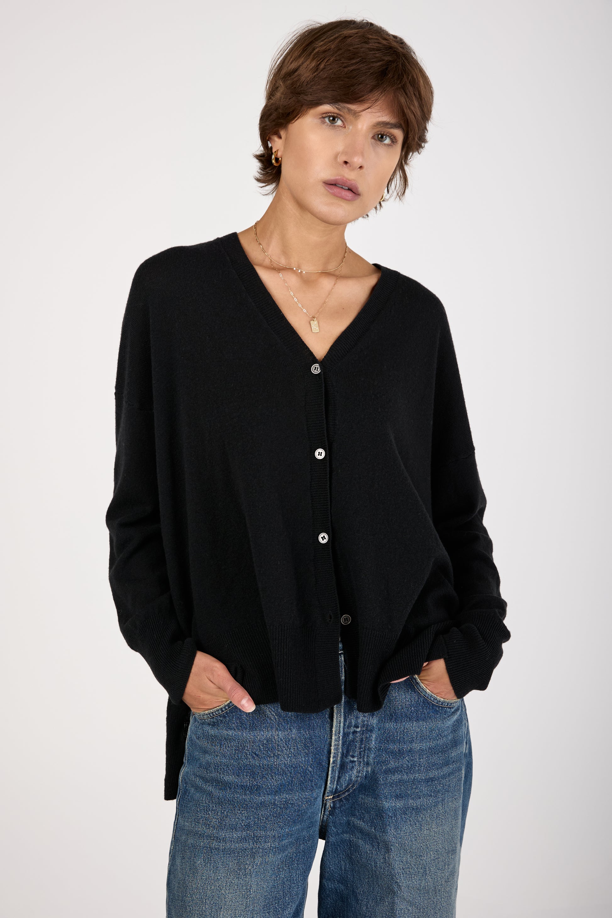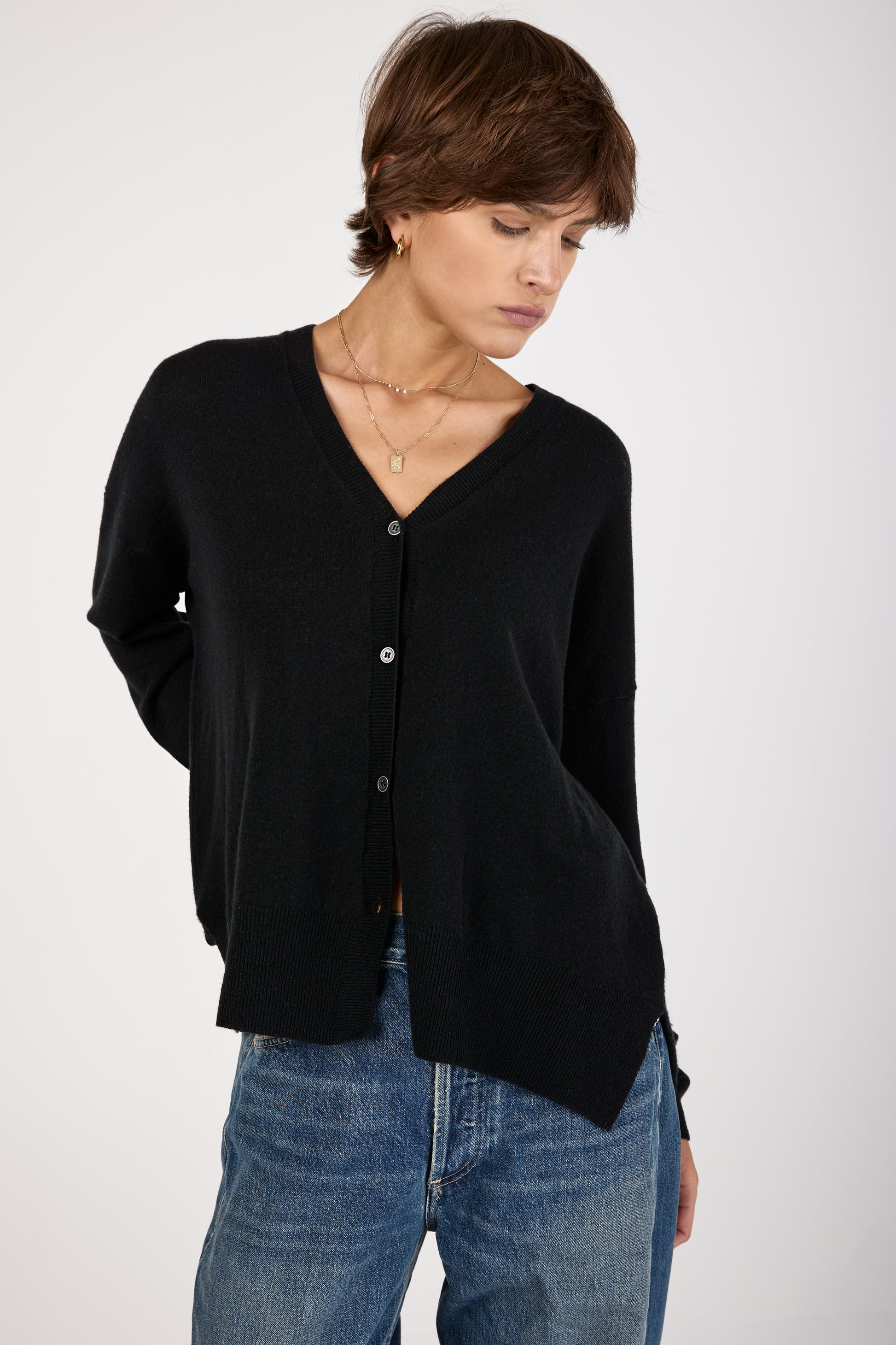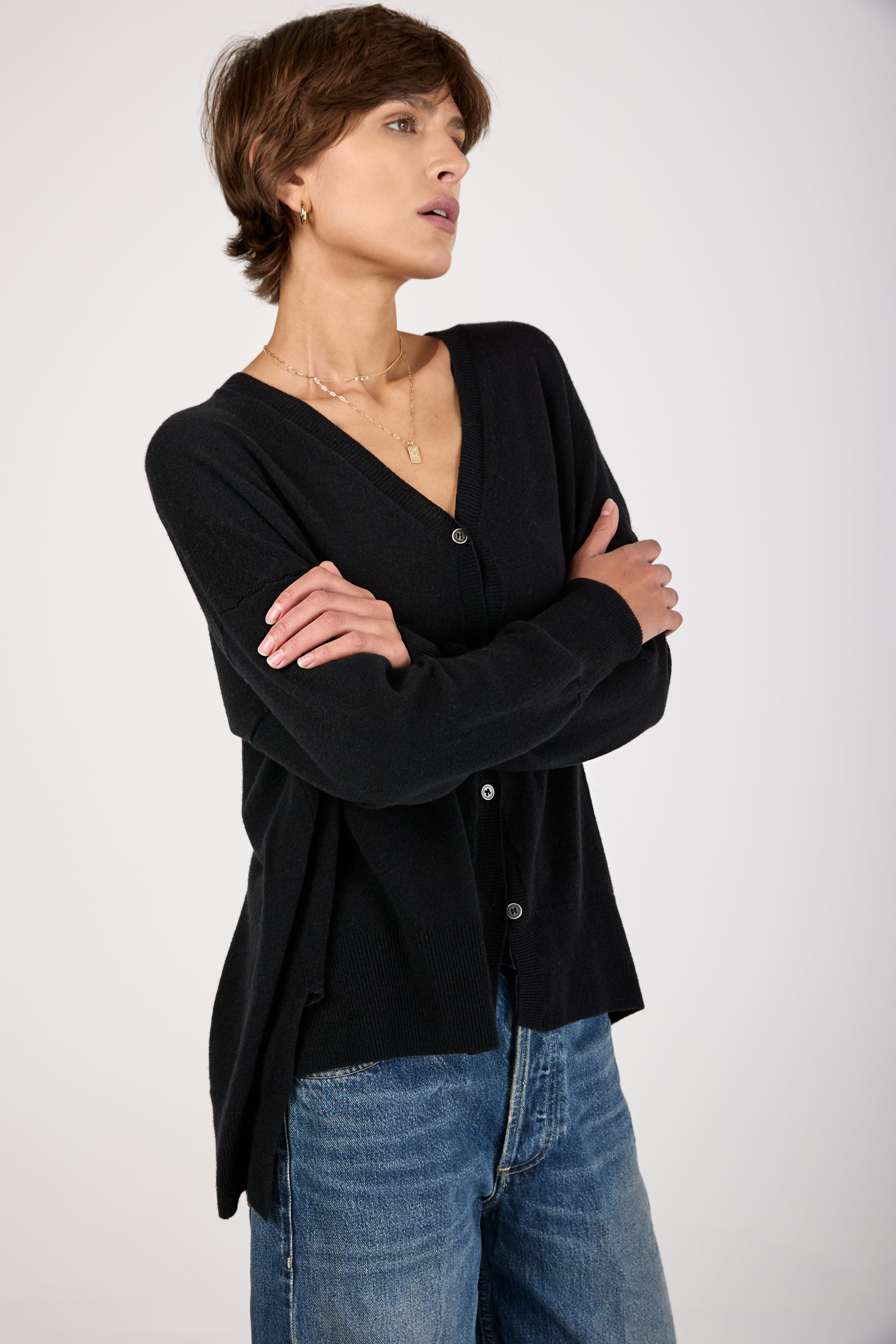 The TRANSIT V-Neck Cardigan Jacket in Black offers timeless sophistication in a luxurious wool-cashmere blend. Made in Italy, this sleek outerwear piece features a tailored fit and minimalist design, perfect for layering over shirts or knits.Ā