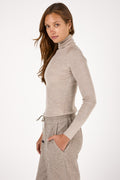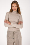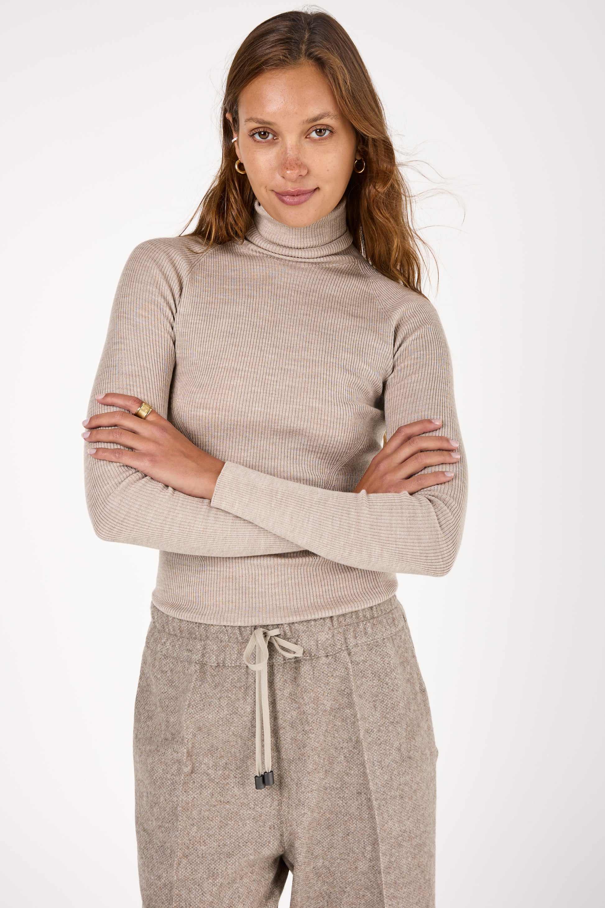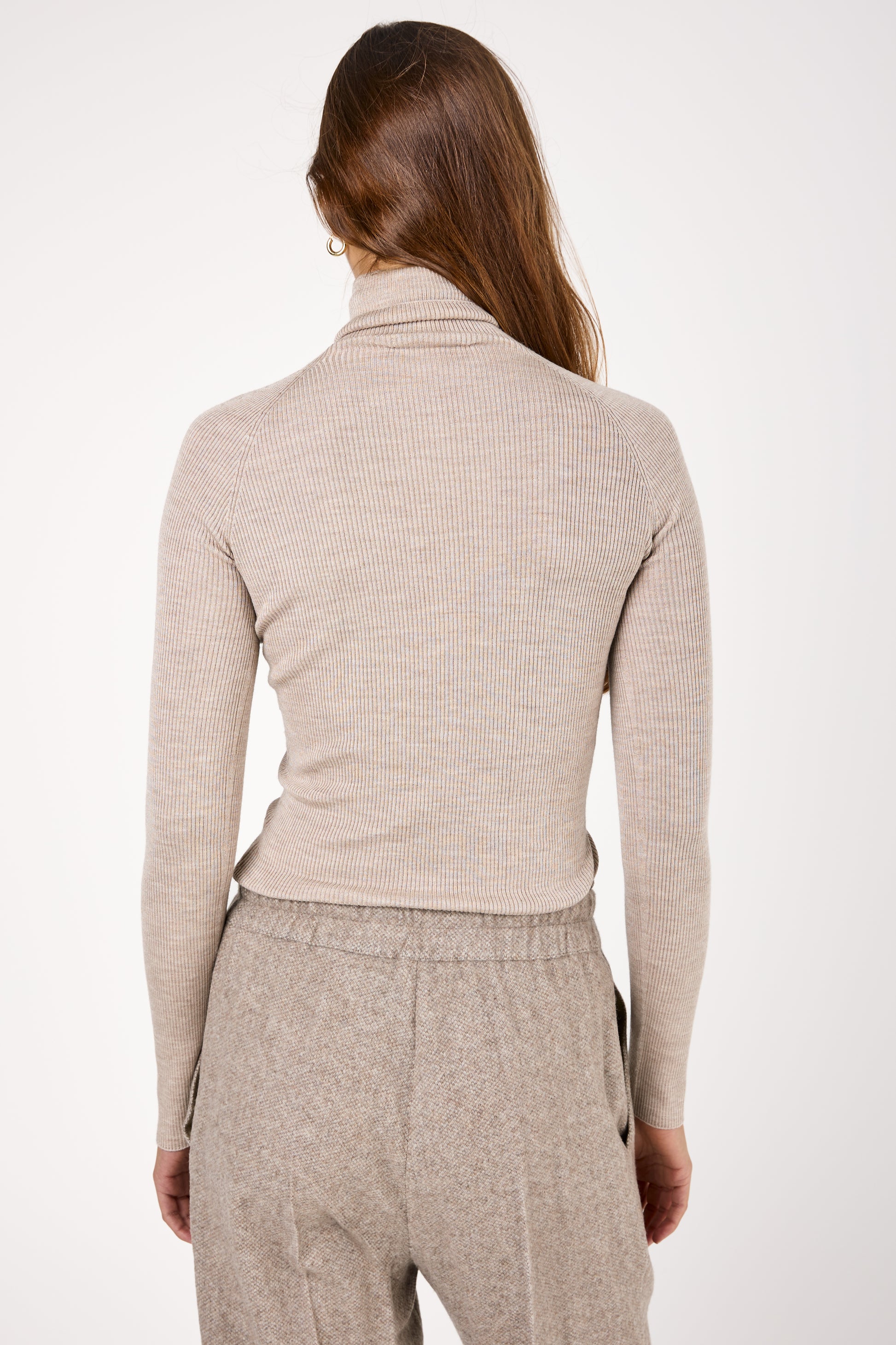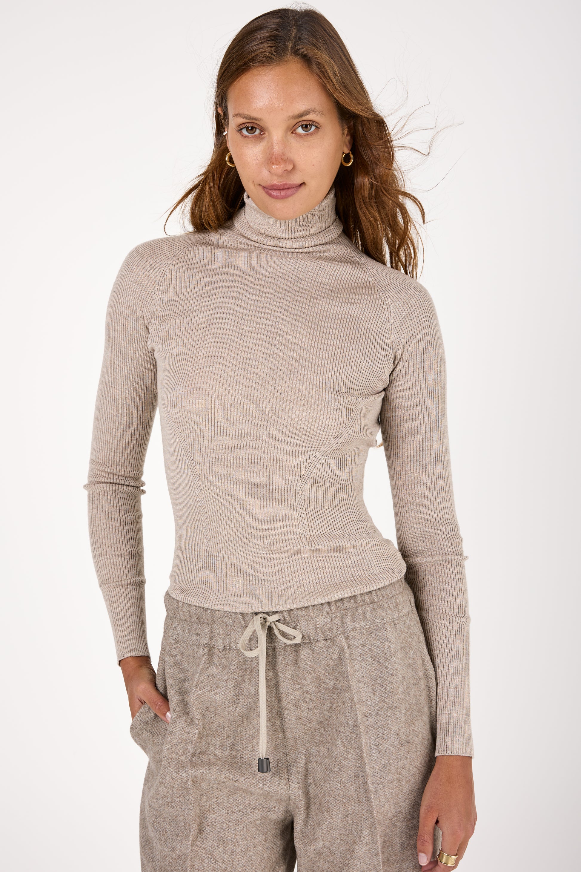 Virgin Wool and Silk Knit Turtleneck Sweater in Sand Beige