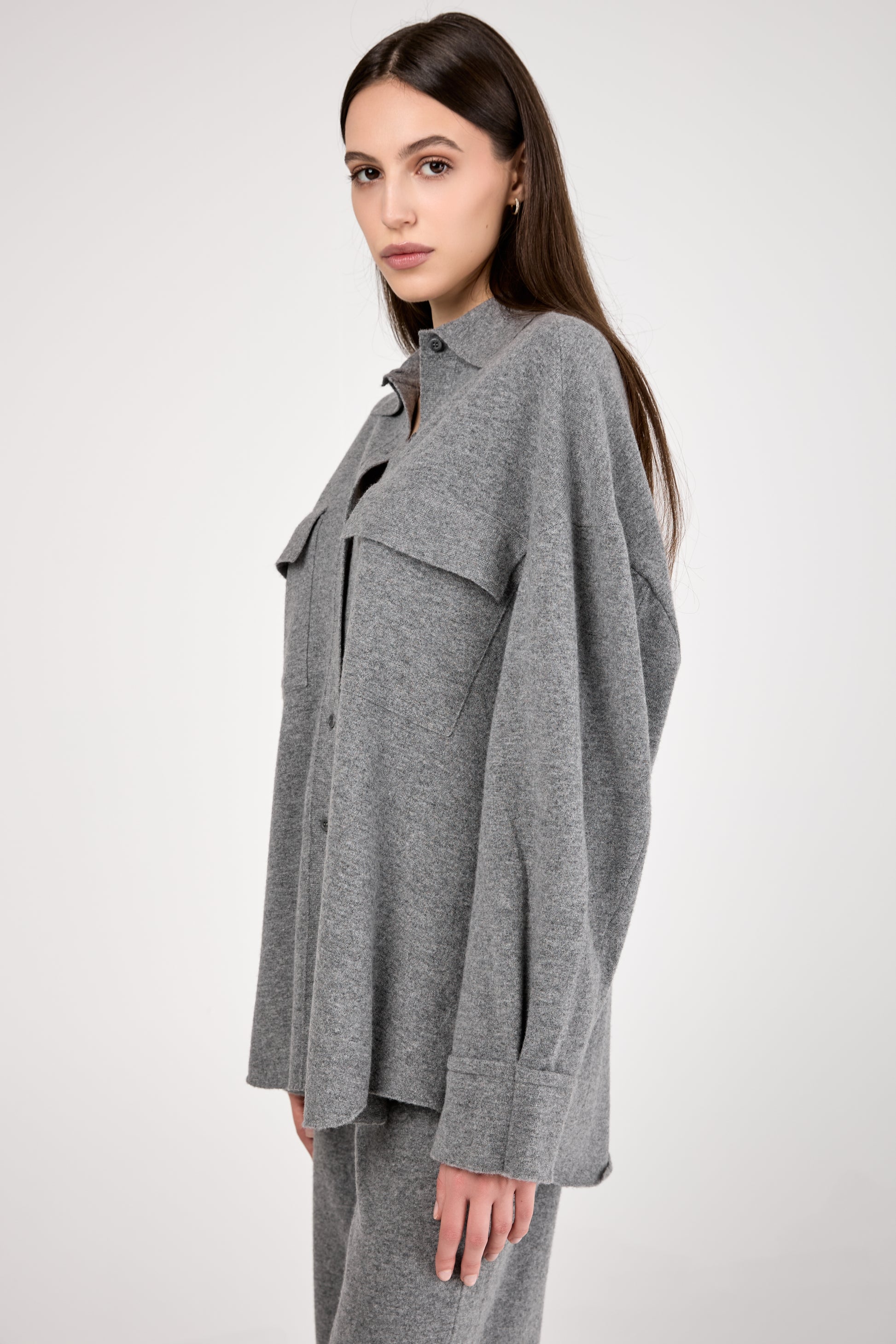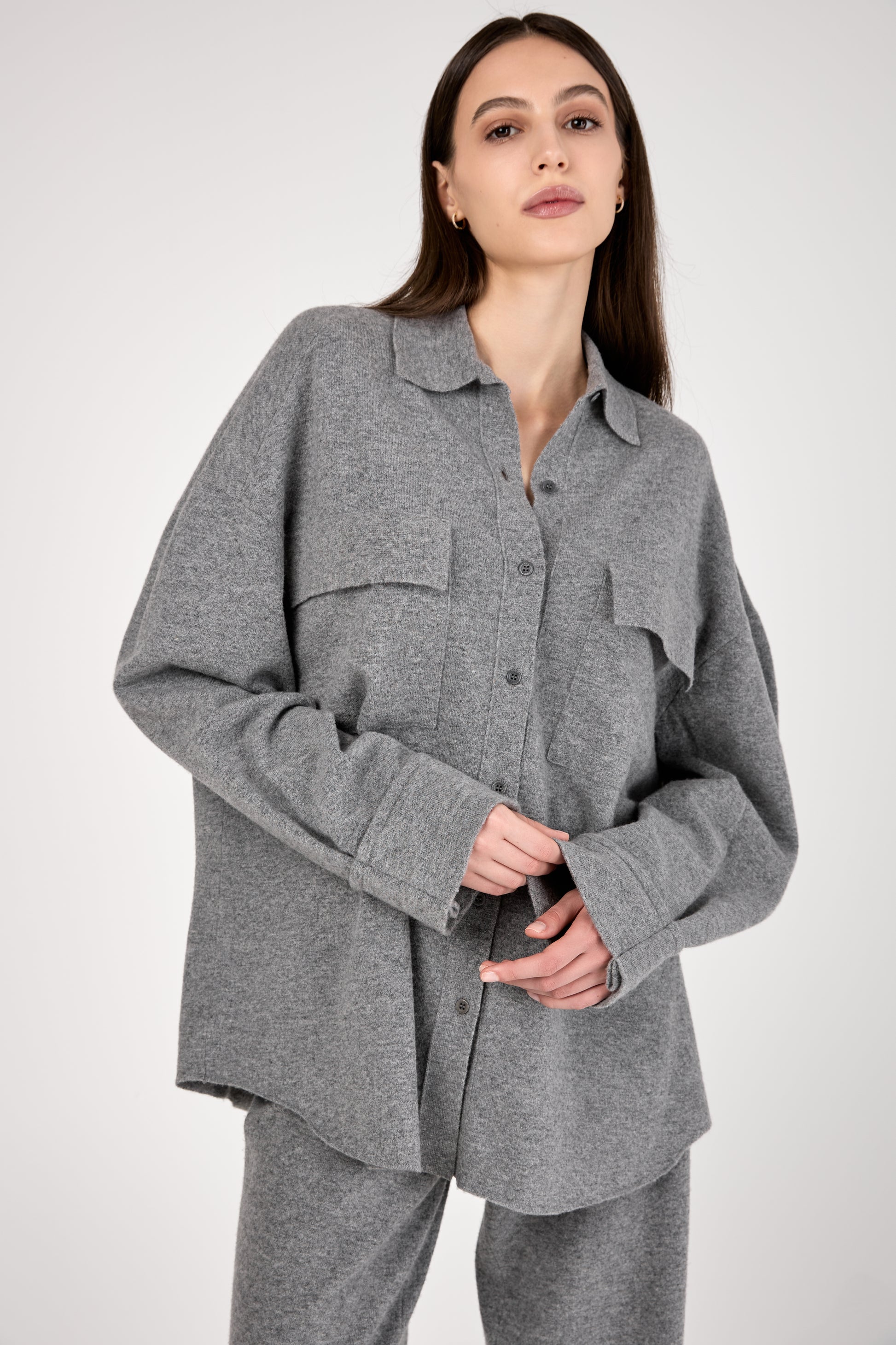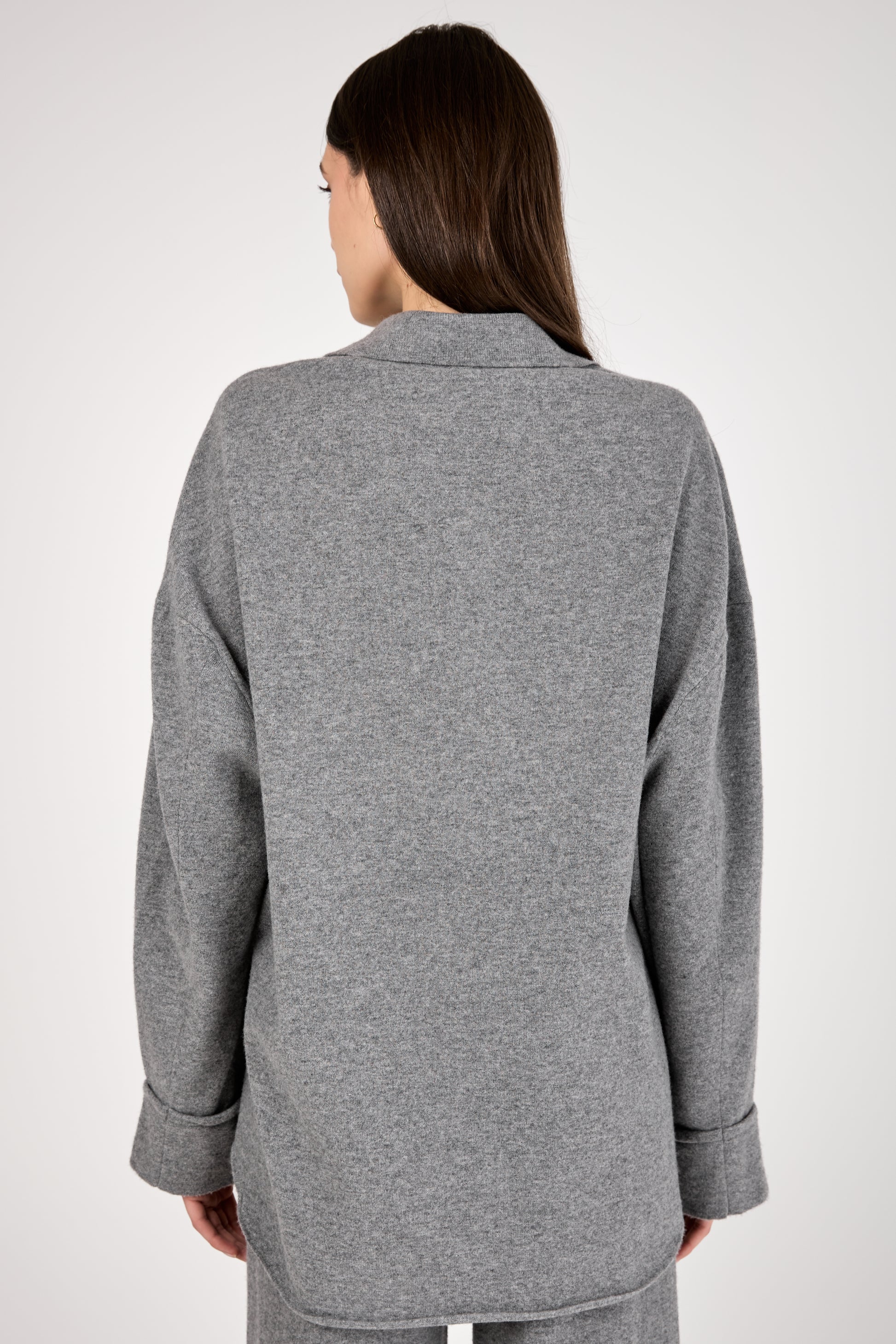 (NUDE) Virgin Wool Felt Shirt Jacket in Grey. 100% Virgin Wool. Button-down shirt with two top front flapped pockets. Perfect to wear over a top in mild weather days. Made in Italy.