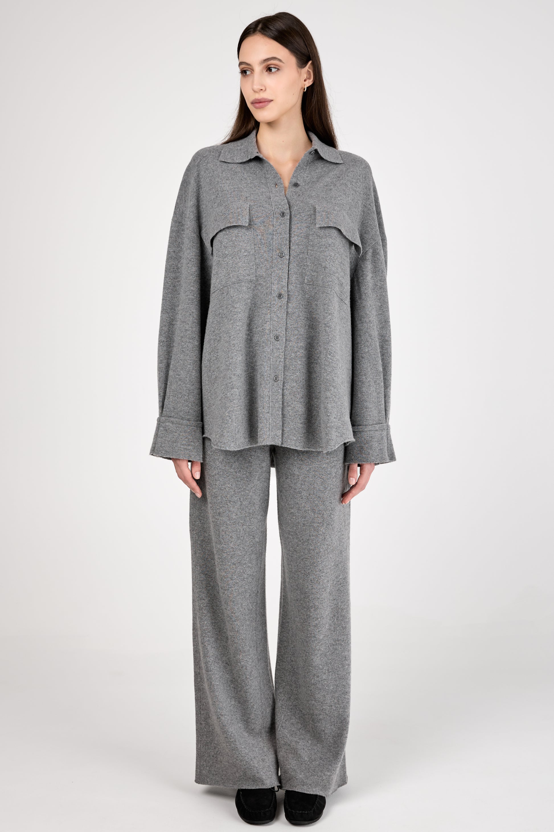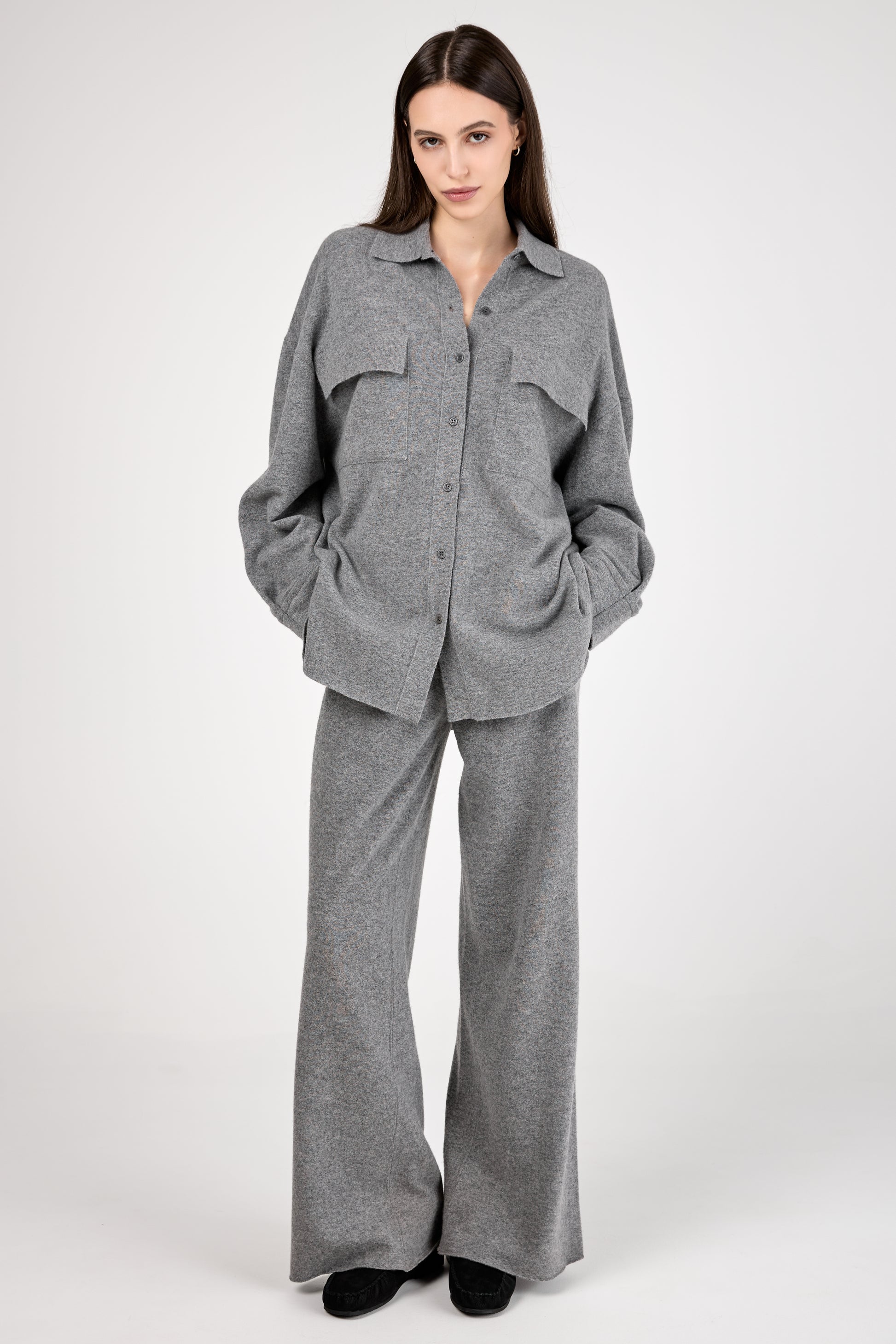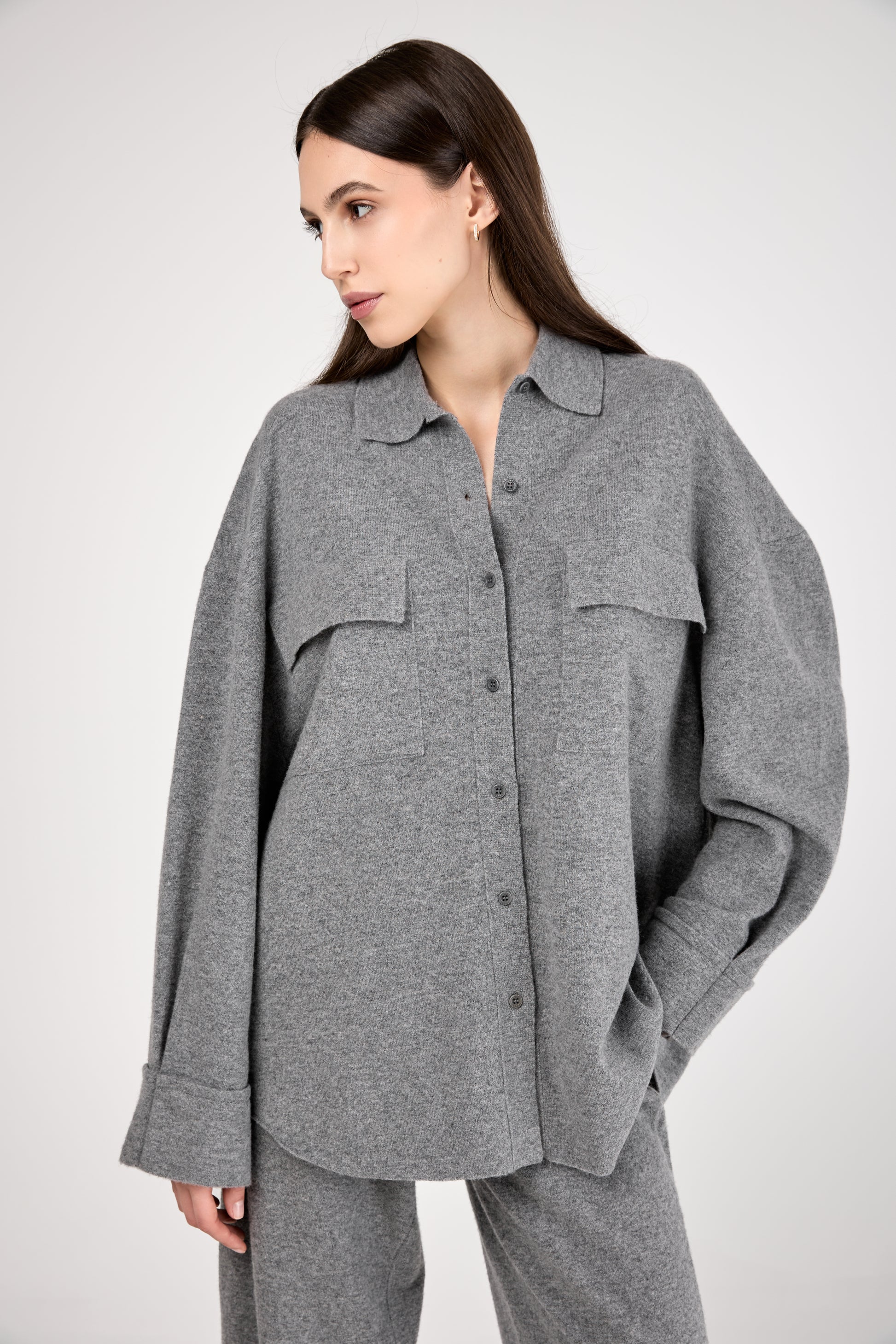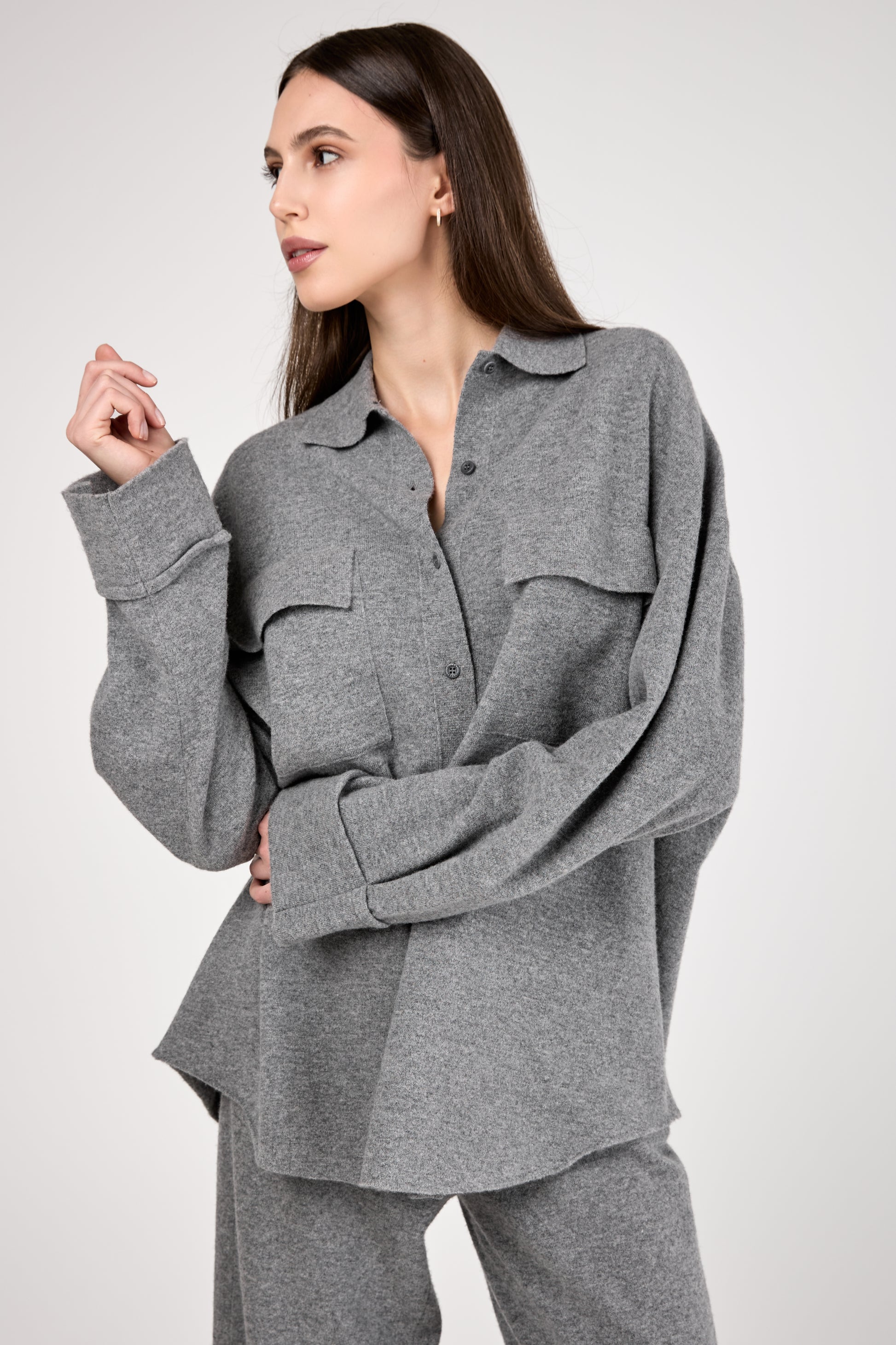 (NUDE) Virgin Wool Felt Shirt Jacket in Grey. 100% Virgin Wool. Button-down shirt with two top front flapped pockets. Perfect to wear over a top in mild weather days. Made in Italy.