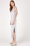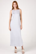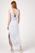 The PESERICO Viscose Long Dress in Crystal Blue is crafted in Italy from fluid, lustrous satin, draping effortlessly for an ethereal, sophisticated look. The refined halter neckline creates a refined, elongating effect, while the open draped back adds a sensual yet tasteful touch. With a sleek, figure-skimming fit, this dress naturally enhances the silhouette, while the side slit introduces a sense of fluidity and ease.Ā
