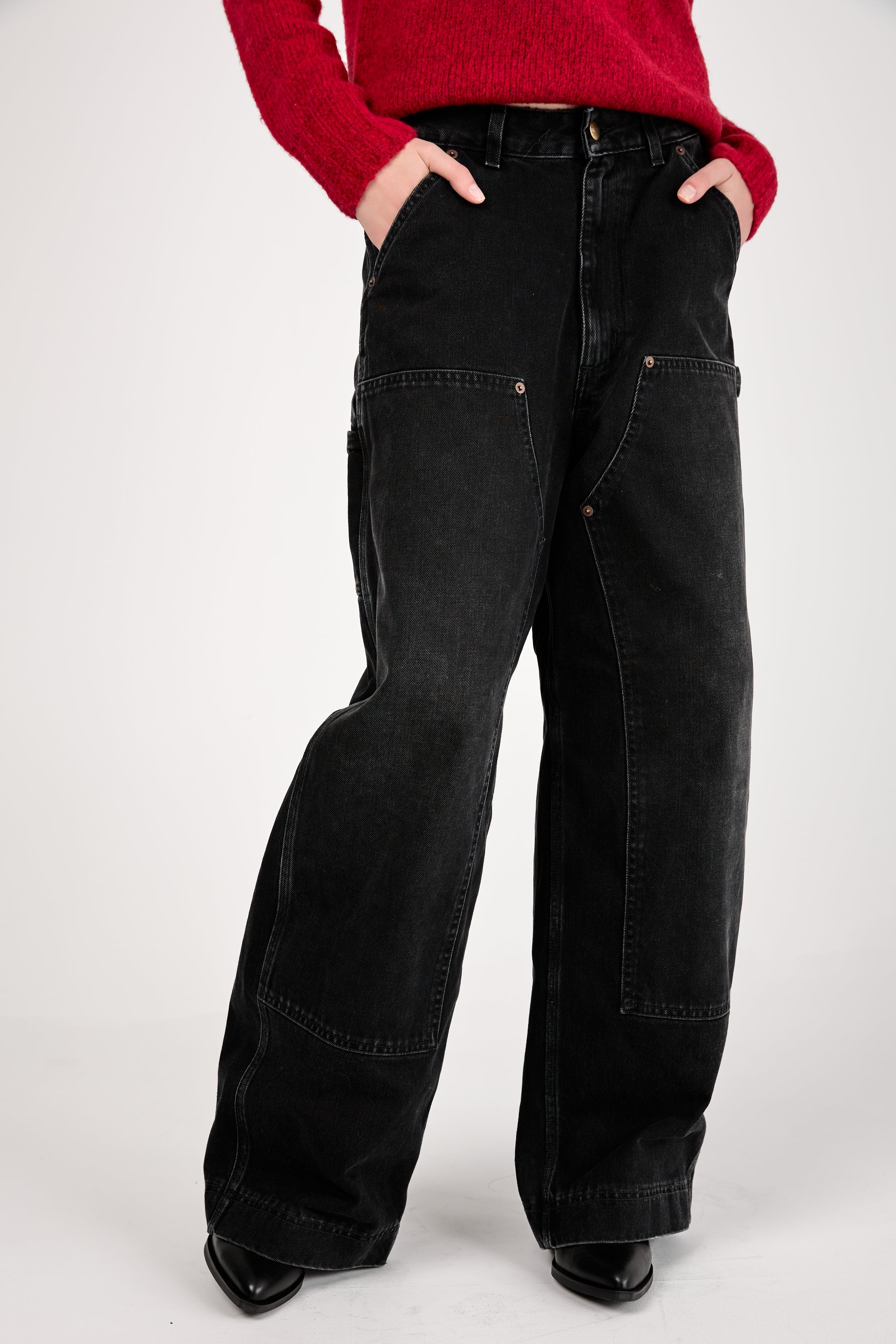The WASHINGTON DEE CEE Oversized Jean in Work Black feature an oversized fit with a low-rise waist and dropped rise, inspired by western workwear. They include unique, functional details such as front panels, a hammer loop, and a tool pocket, blending functionality and style for a striking, utility-inspired look.Ā