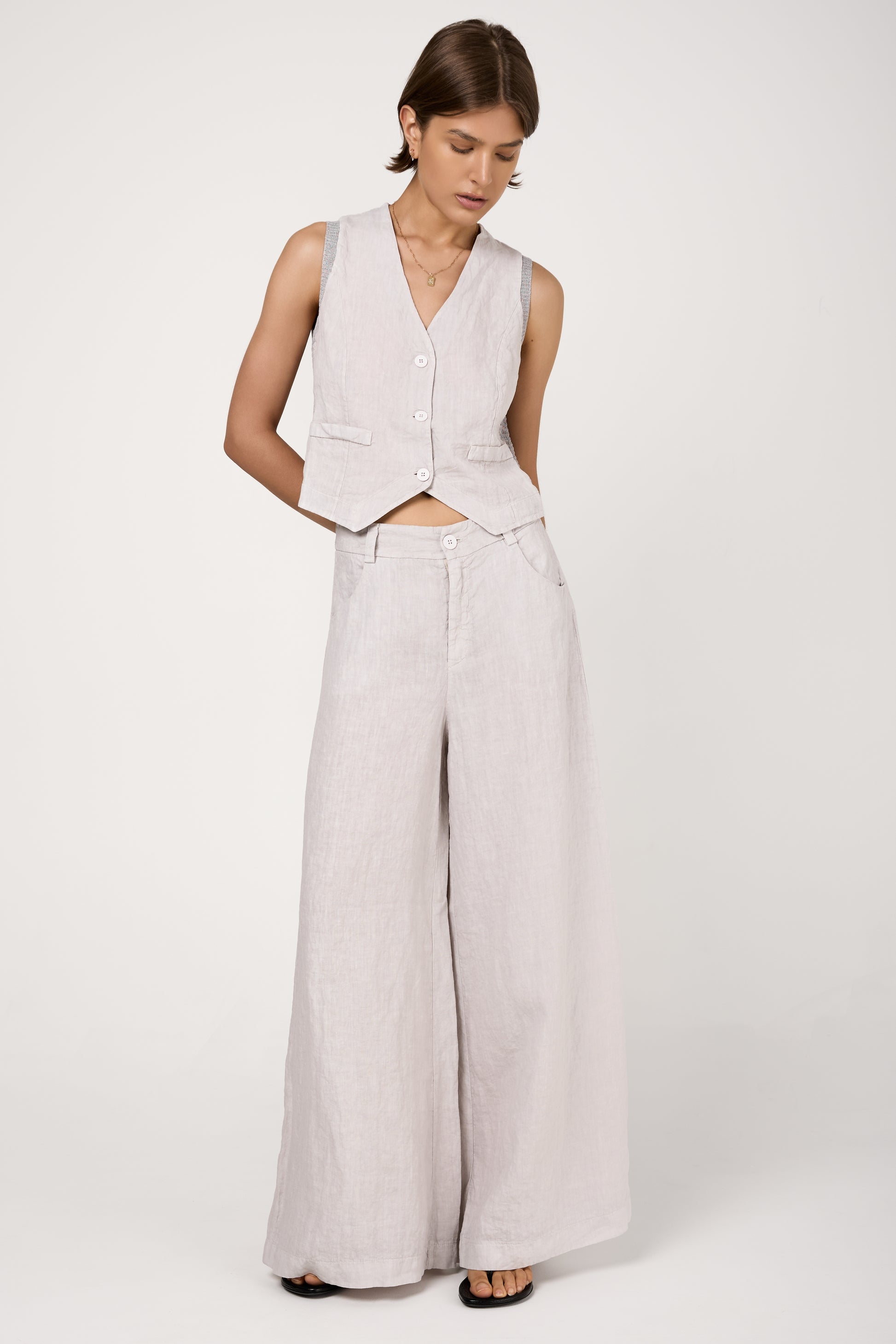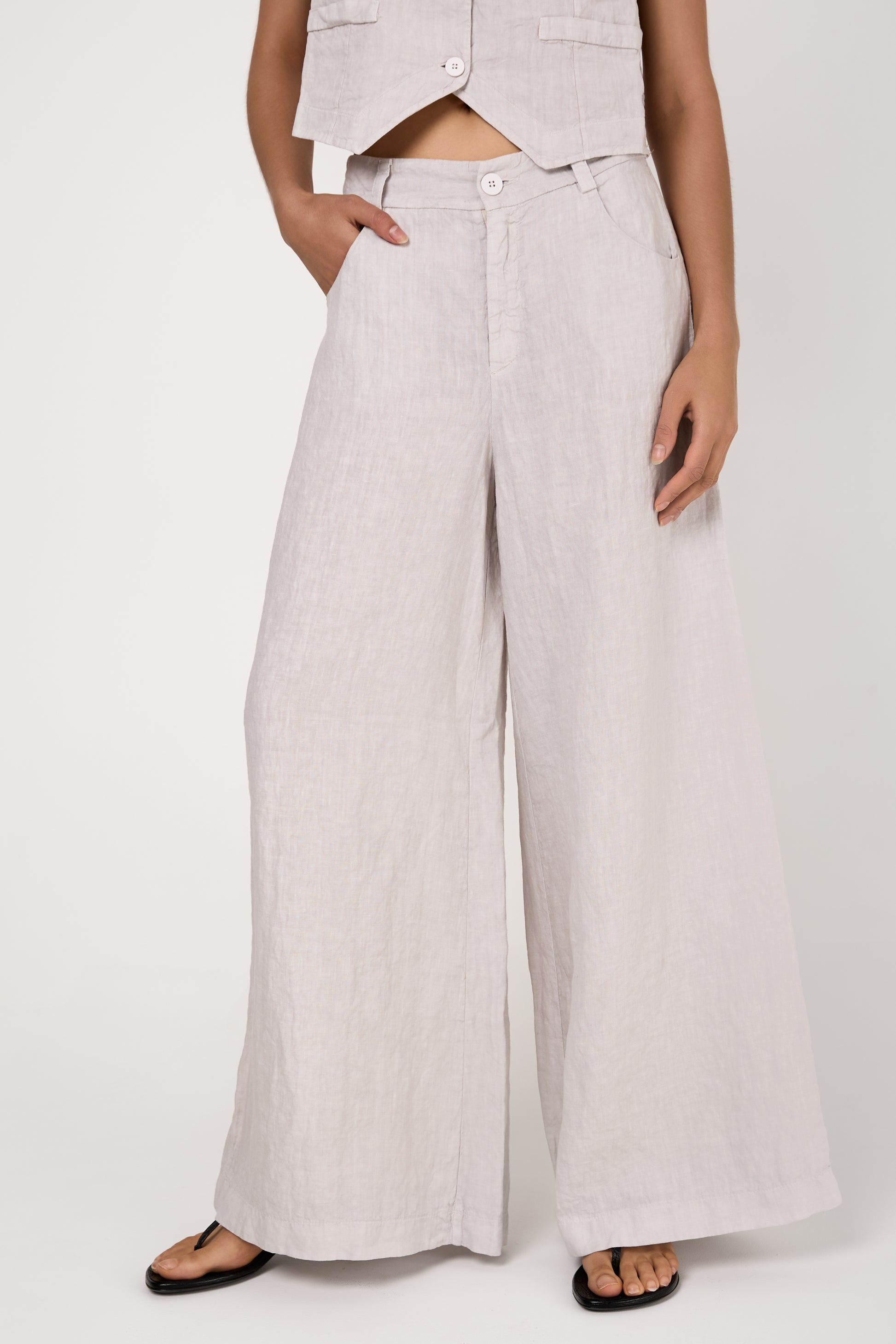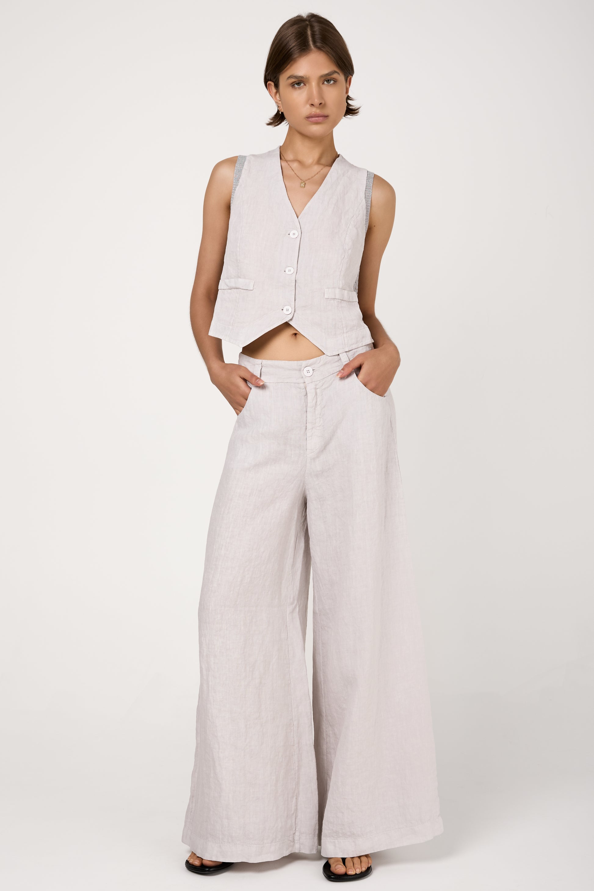 The TANDEM Linen Trouser Pant in Ice captures the essence of laid-back sophistication. Crafted in Italy from premium, breathable linen, these trousers feature a fluid drape that moves with elegance. The high-rise silhouette elongates the leg, while the subtle texture and ice hue evoke a sense of understated elegance.