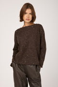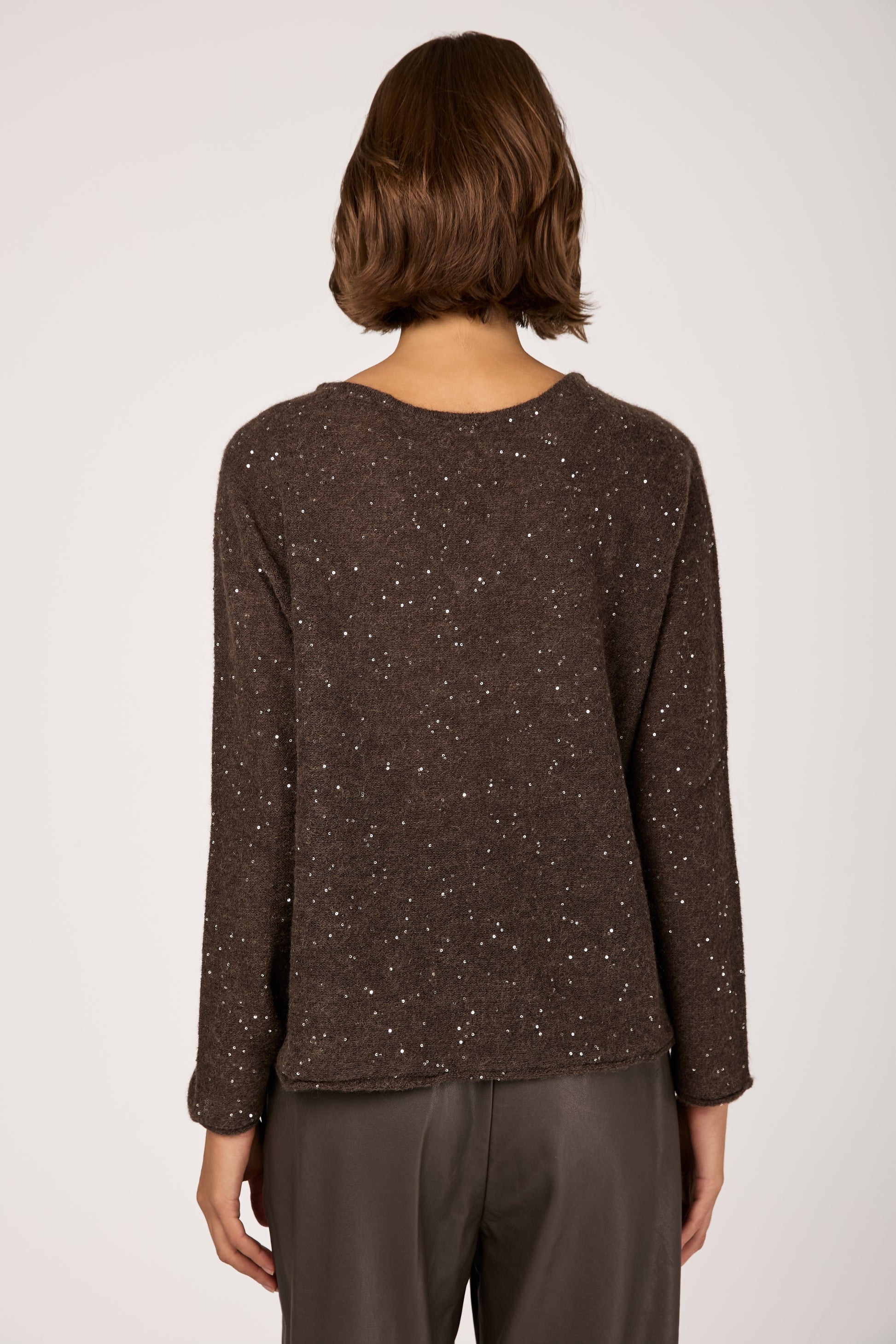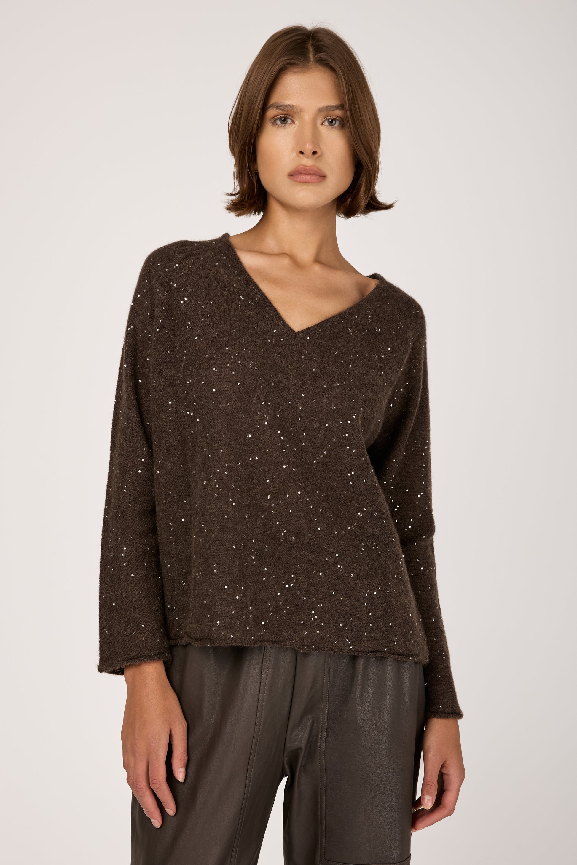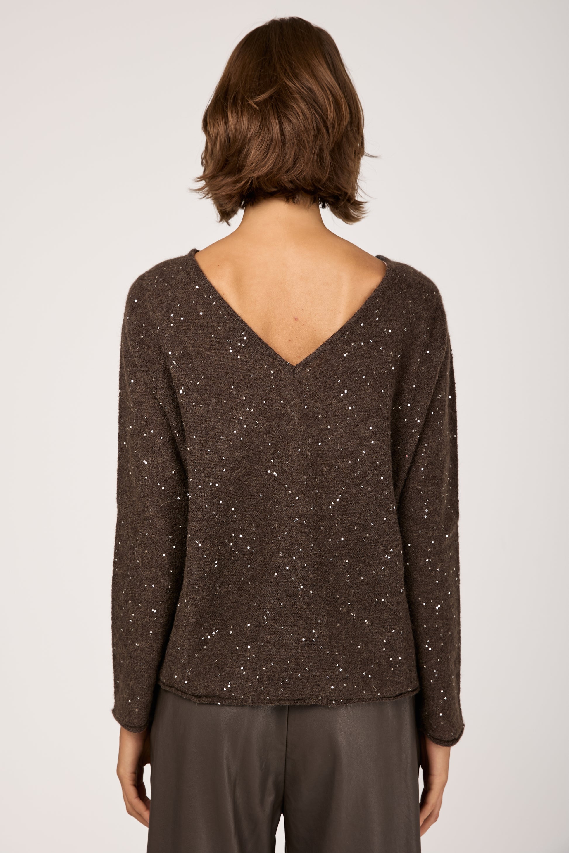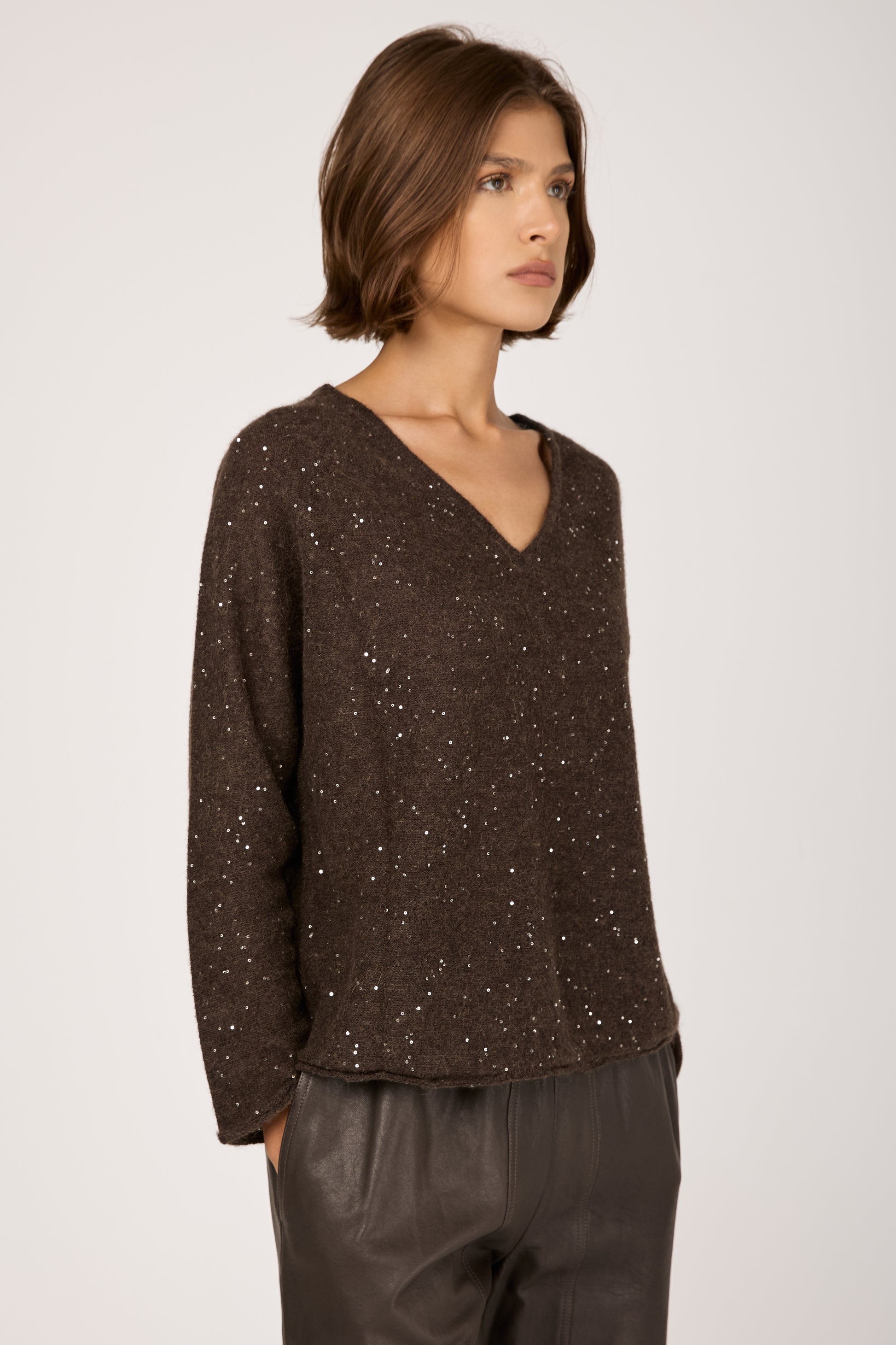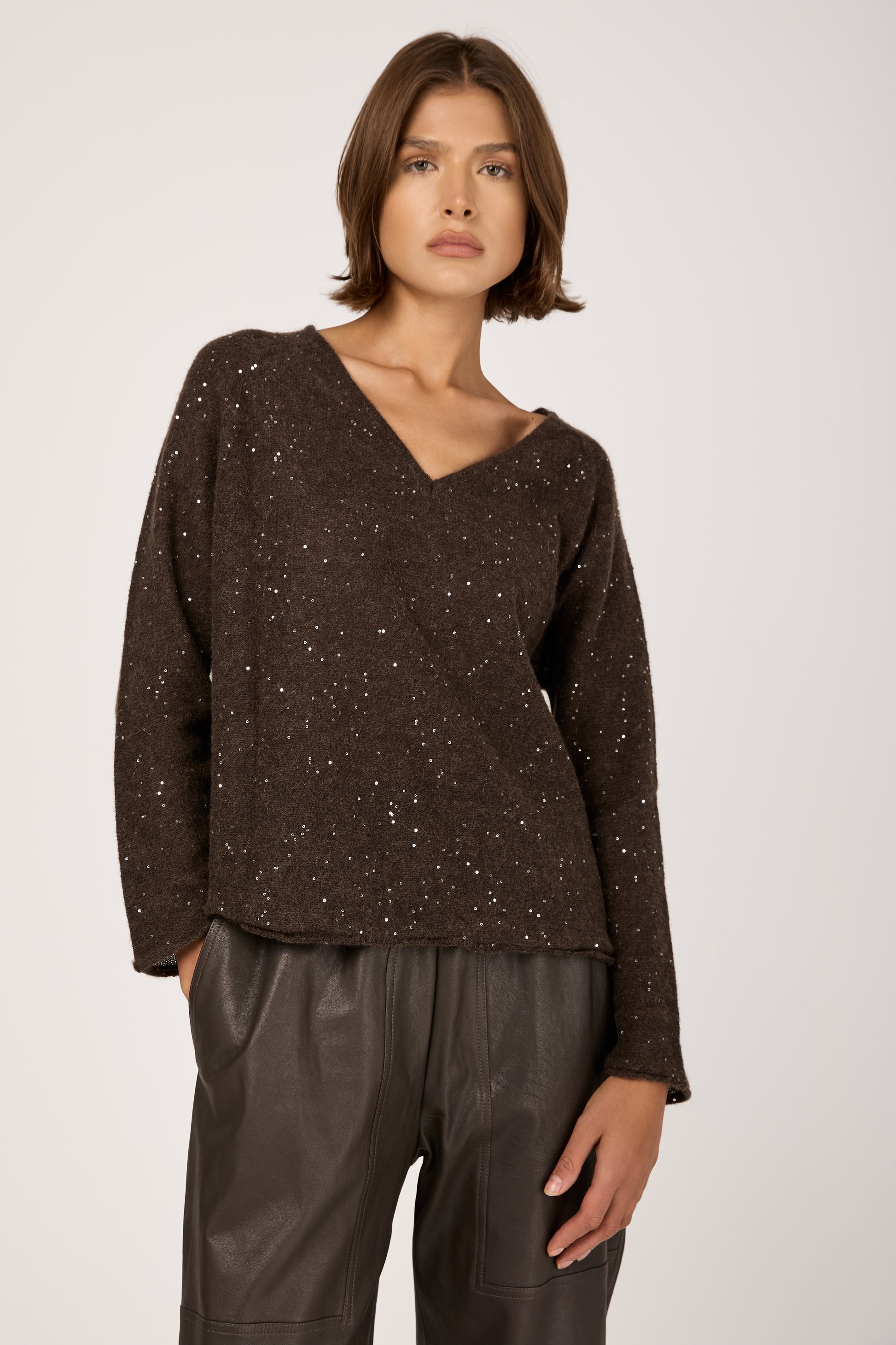 The GENTRYPORTOFINO Wool Knit Sweater in Mastice is crafted in Italy from a soft blend of mohair, alpaca wool, and viscose, offering exceptional warmth and a luxurious feel. Its earthy brown tone is enhanced with subtle flecks of shimmering sequins, adding refined texture and light. Designed to be worn both front and back, switching from a boat neck to a V-neck, it combines timeless elegance with modern versatility.
