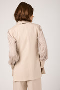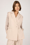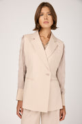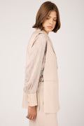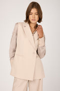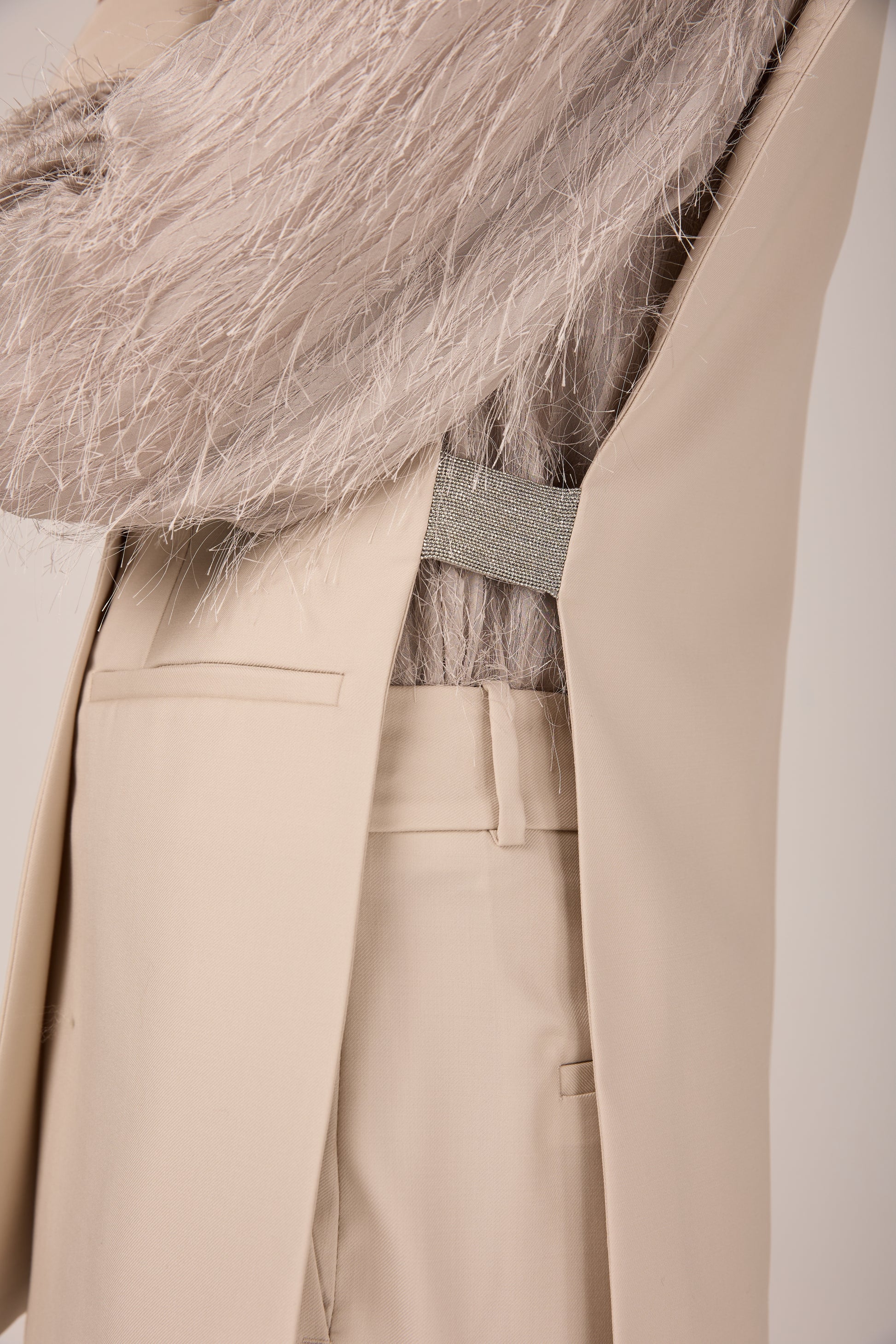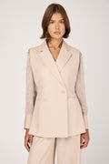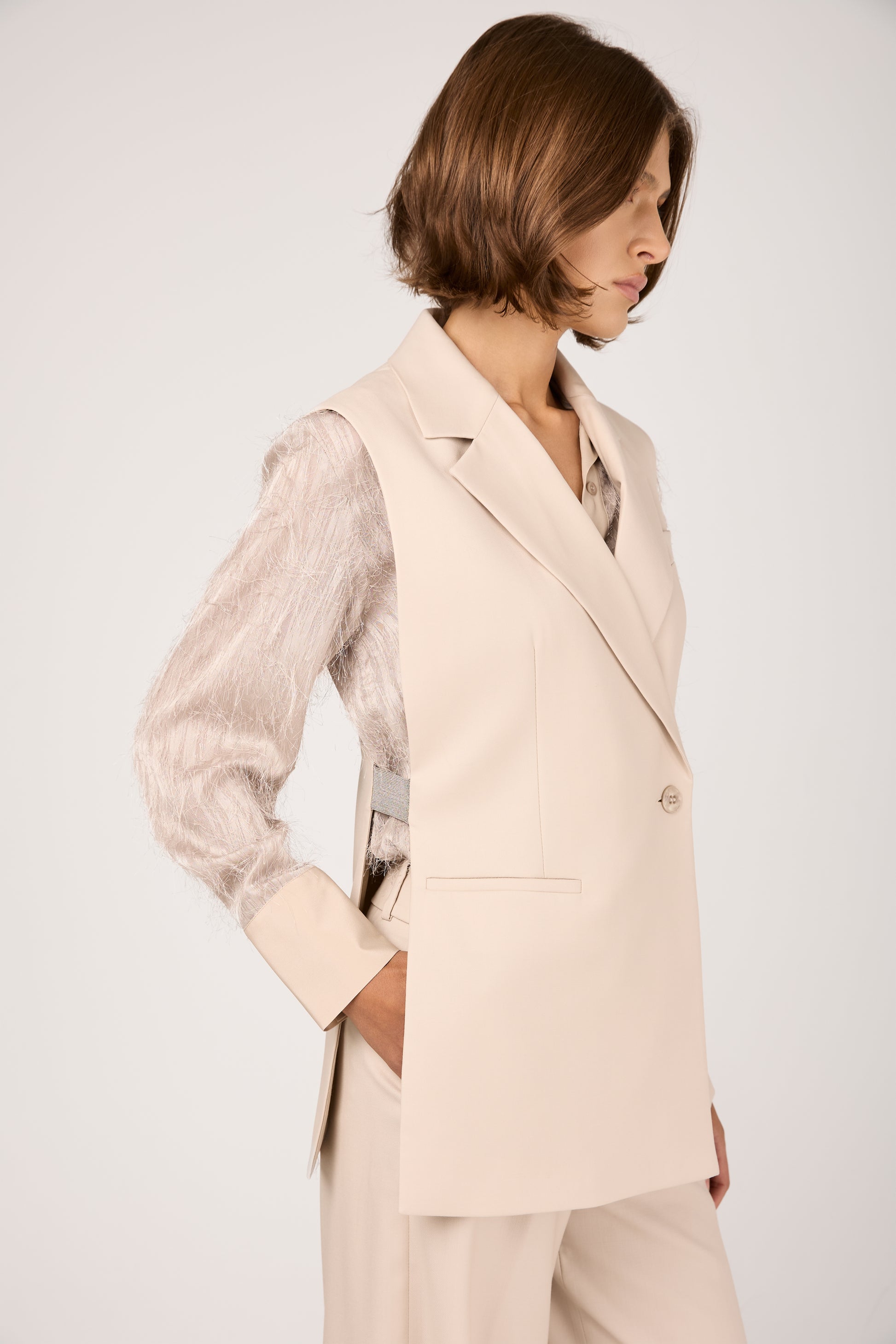 The PESERICO Wool Twill Vest in Amber Beige is crafted in Italy from 110's Estrato Comfort pure wool twill, an iconic tailoring fabric. Blending masculine structure with a subtle feminine edge, it is exceptionally fine, naturally elasticated, and supremely comfortable. Designed with notch lapels, welted pockets, and open sides accented with a delicate frog detail, it showcases meticulous tailoring. Fully lined for comfort, the vest offers a refined, polished finish.Ā