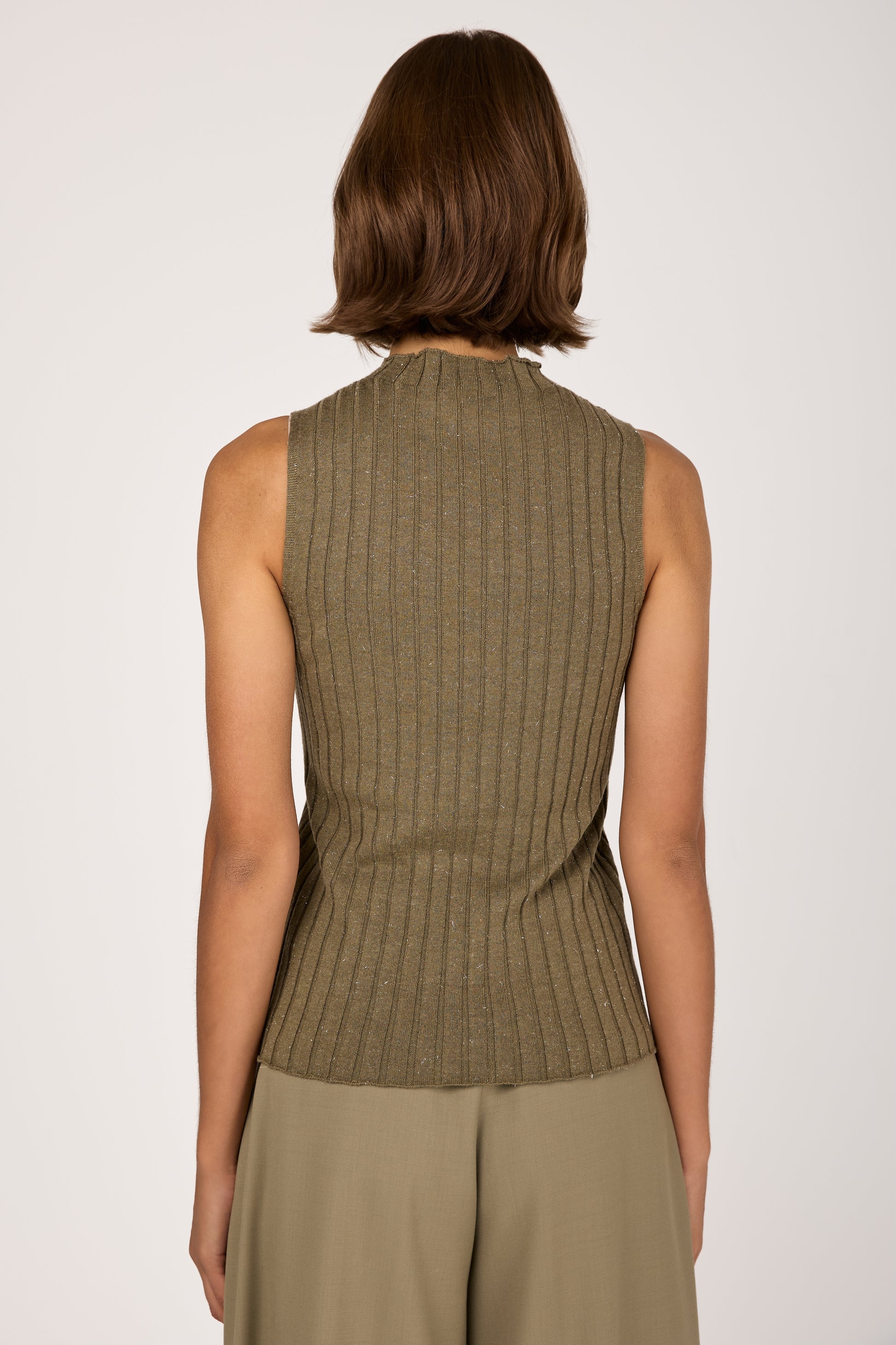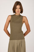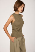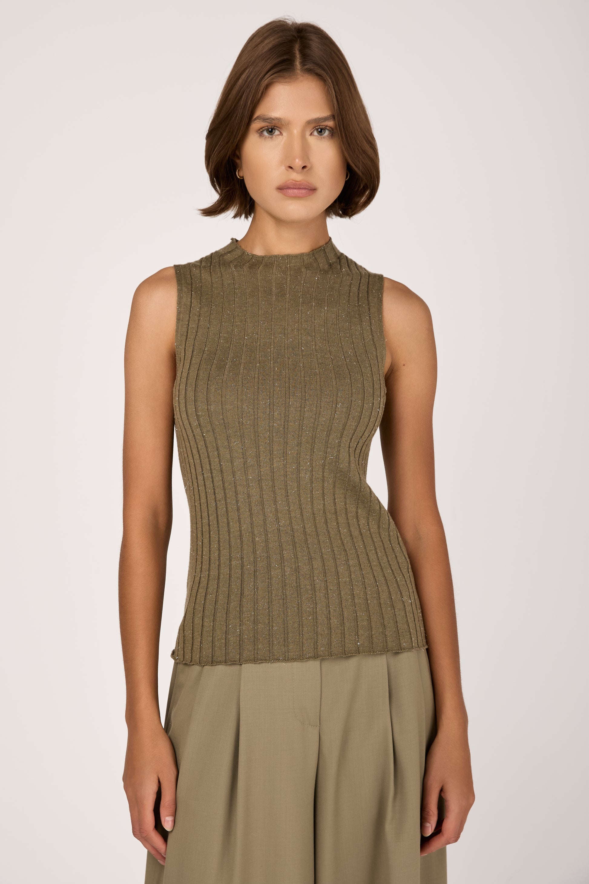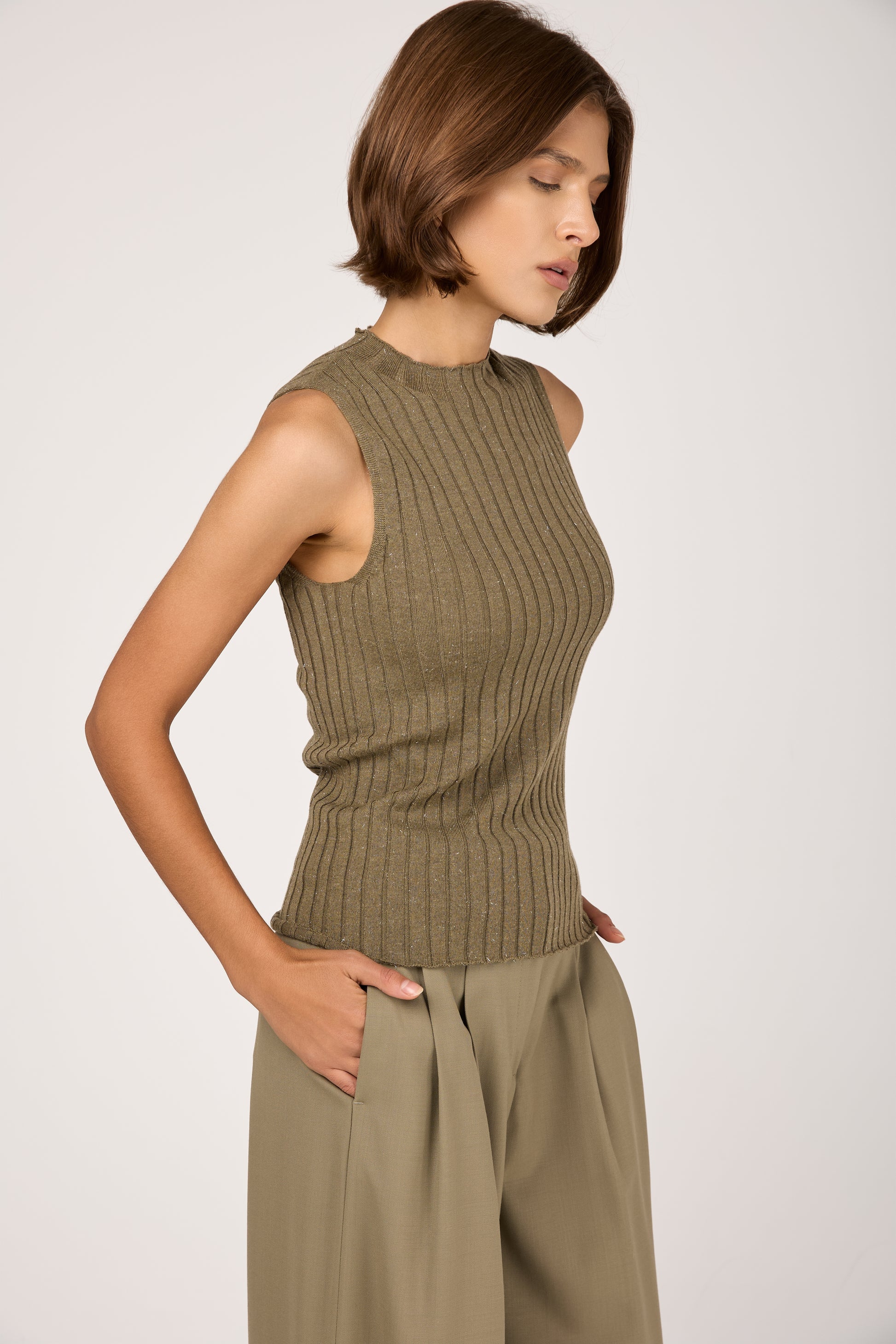 The PESERICO Wool Viscose Knitted Top in Lurex Clay Green is meticulously crafted from a luxurious blend of wool and viscose yarn, delicately interwoven with lurex for a subtle touch of shimmer. The ribbed texture enhances its elegant silhouette, offering both comfort and sophistication. This versatile sleeveless knitted top transitions effortlessly from day to evening.