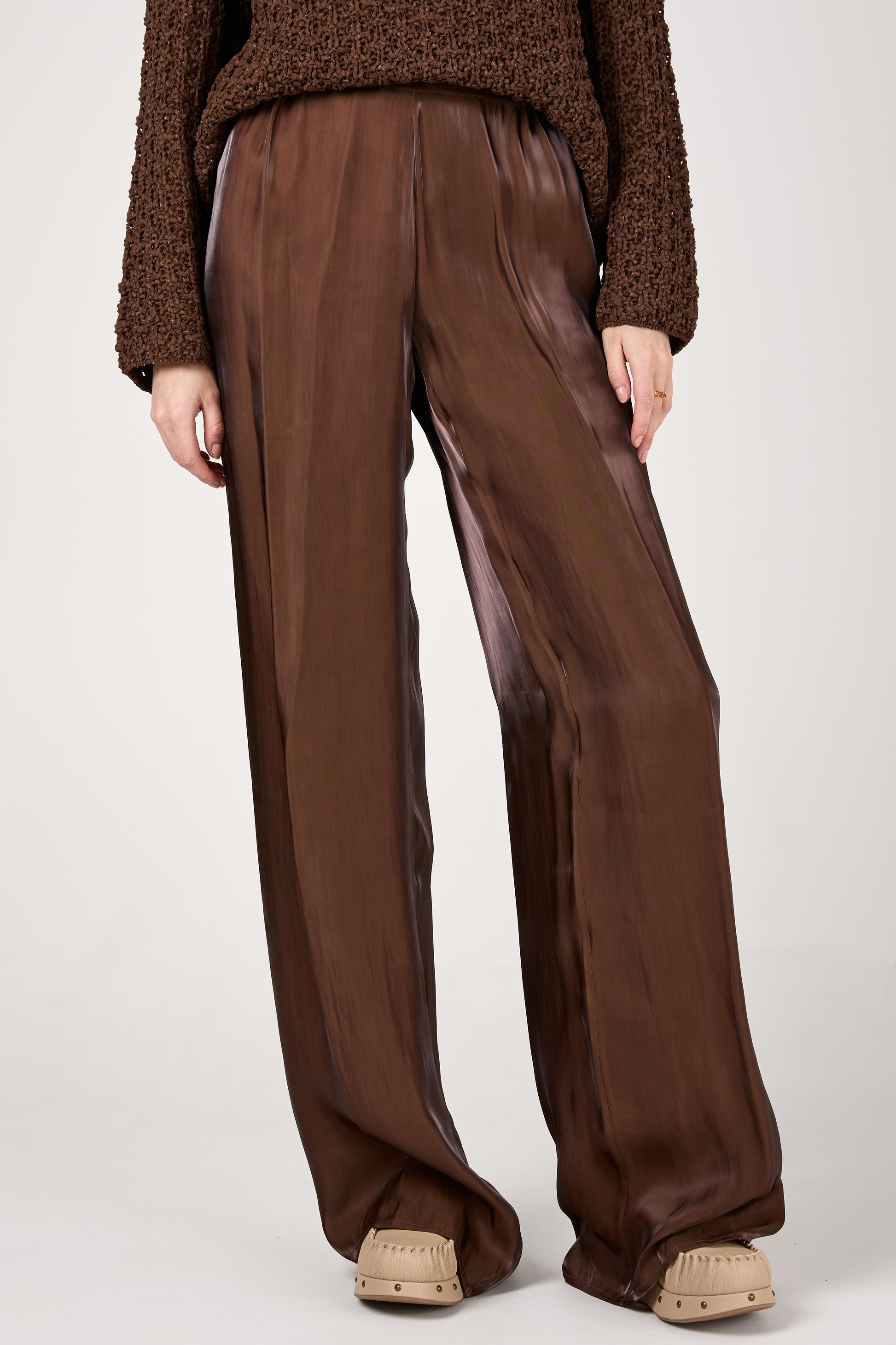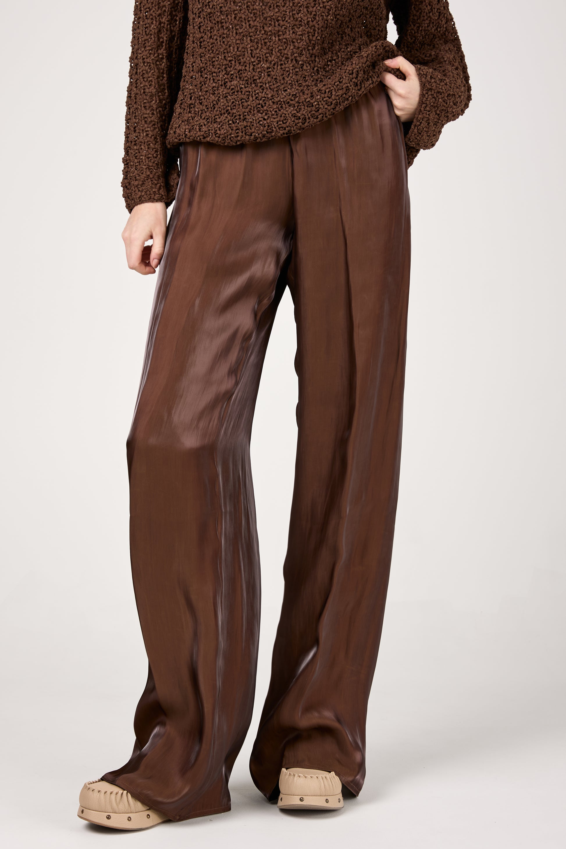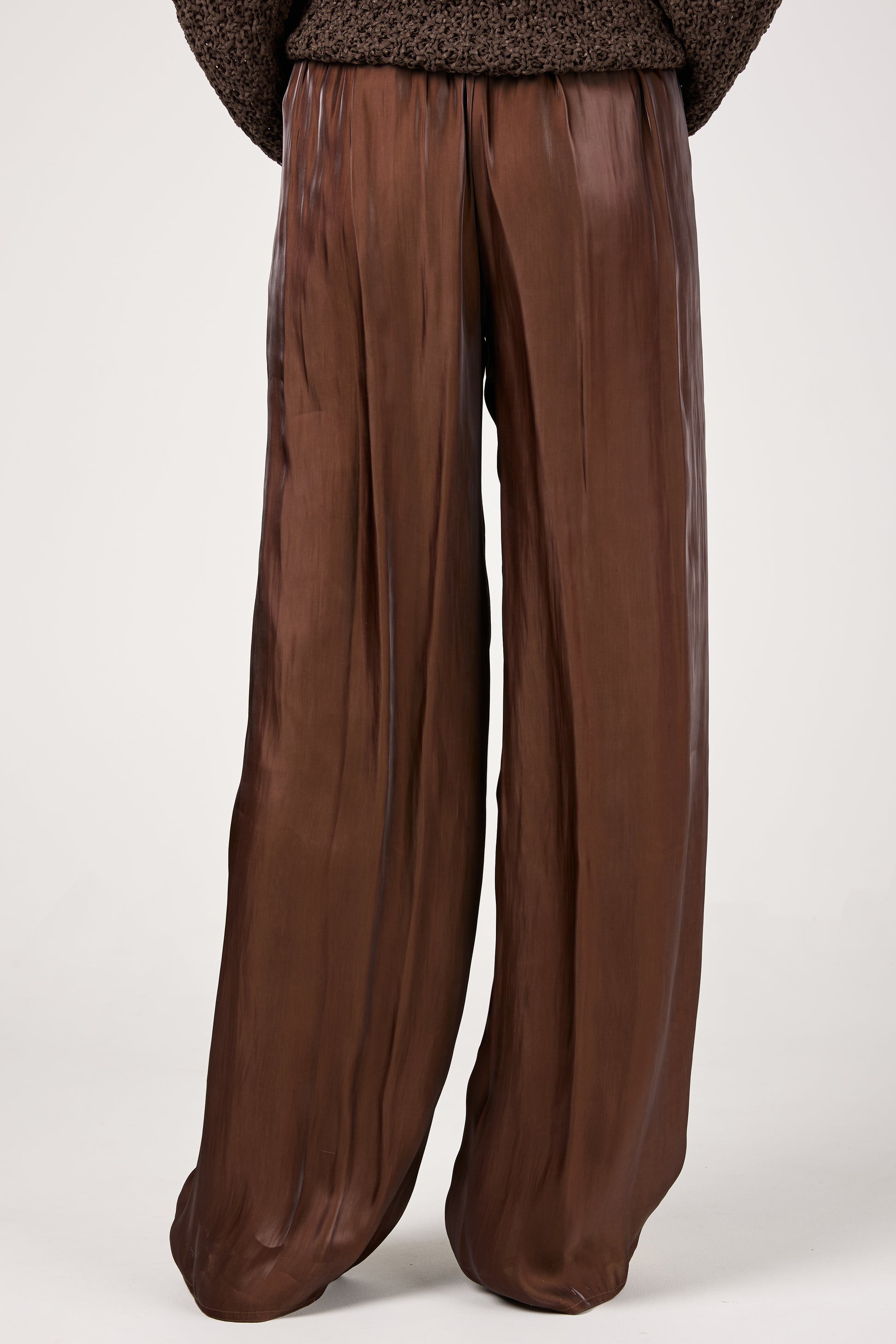 GENTRYPORTOFINO Fluid Iridescent Pant in Marone. Timeless wardrobe essential, expertly crafted in Italy from a lustrous, lightweight fabric . Designed with a wide-leg silhouette, these trousers drape beautifully, exuding effortless sophistication. The relaxed fit and elasticized waistband ensure both comfort and style.