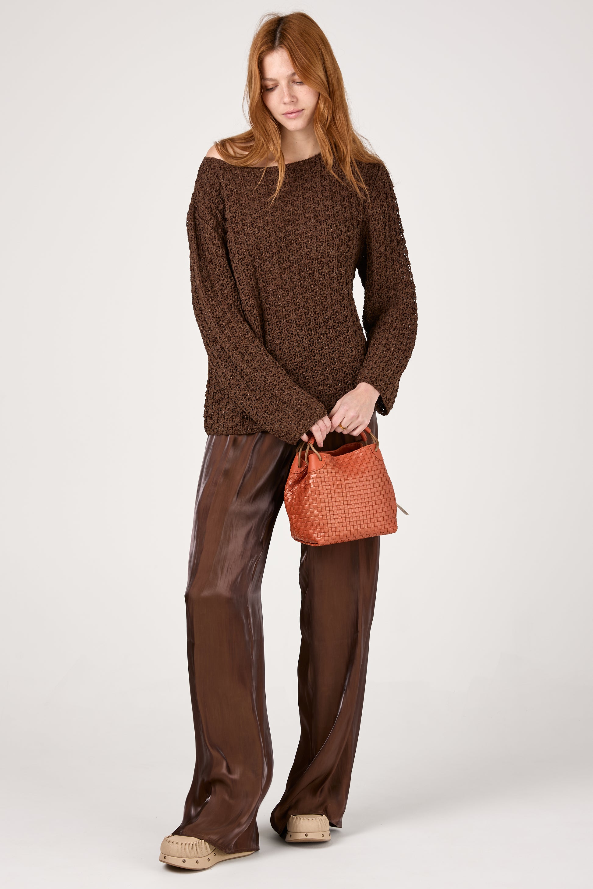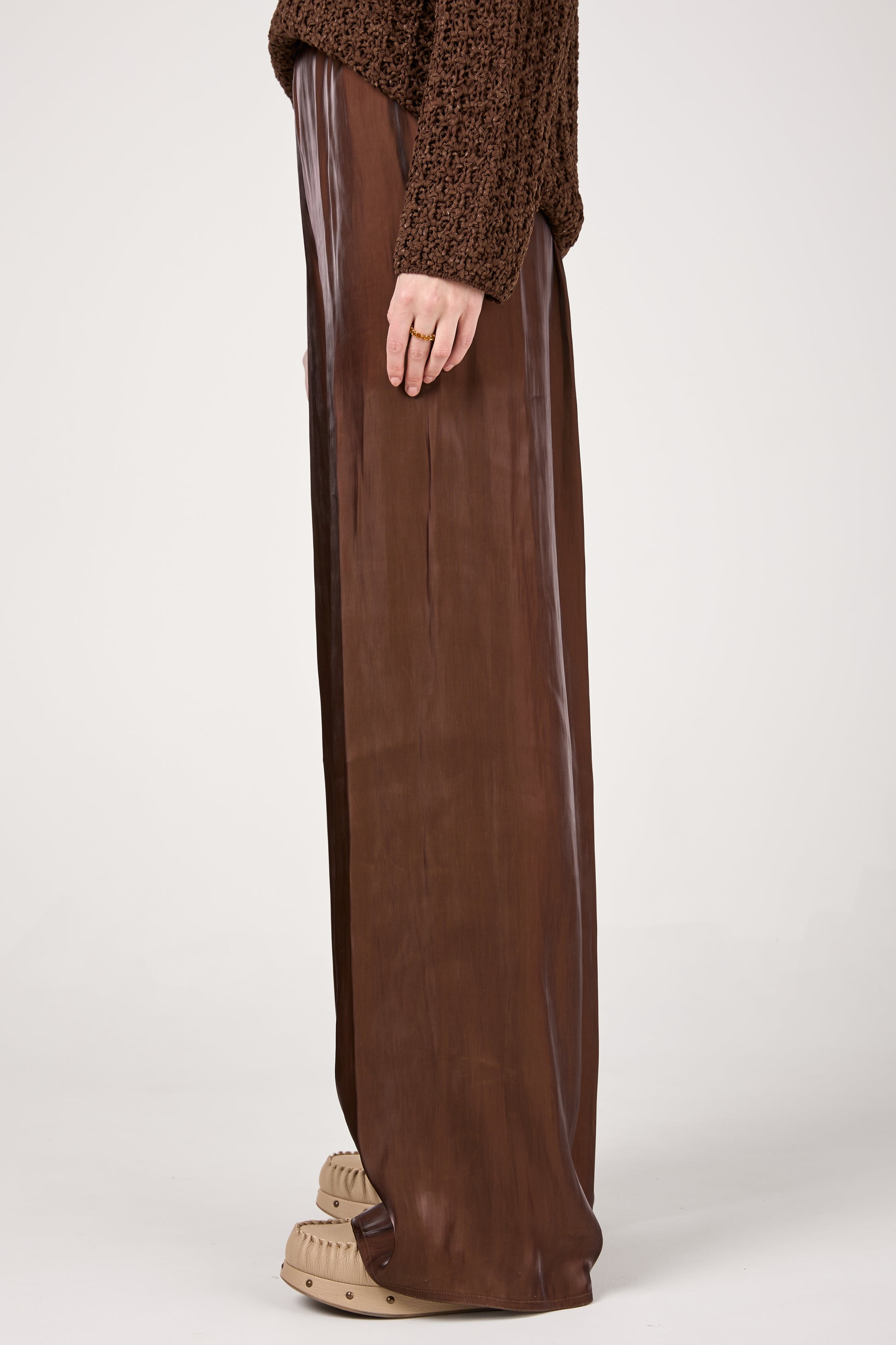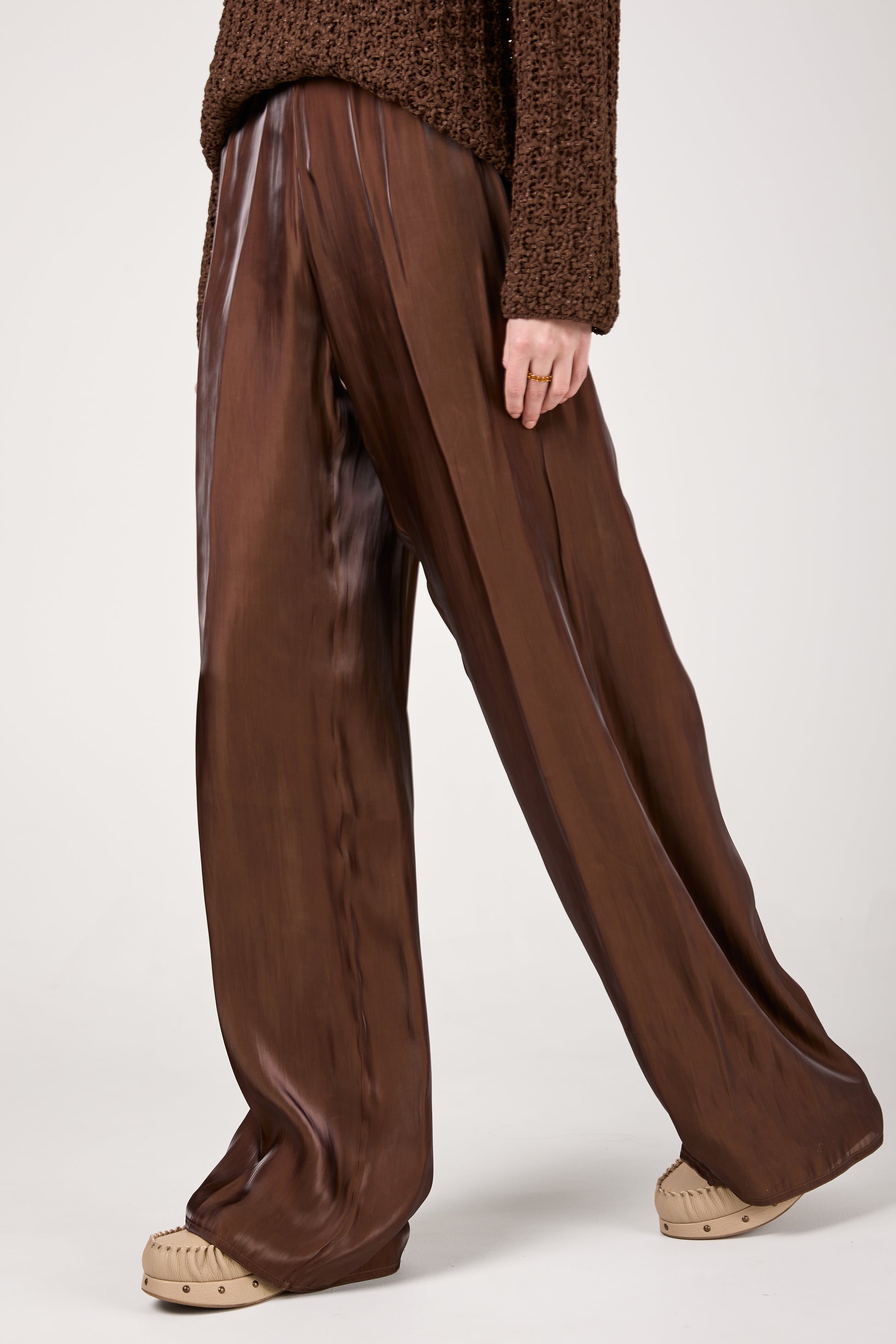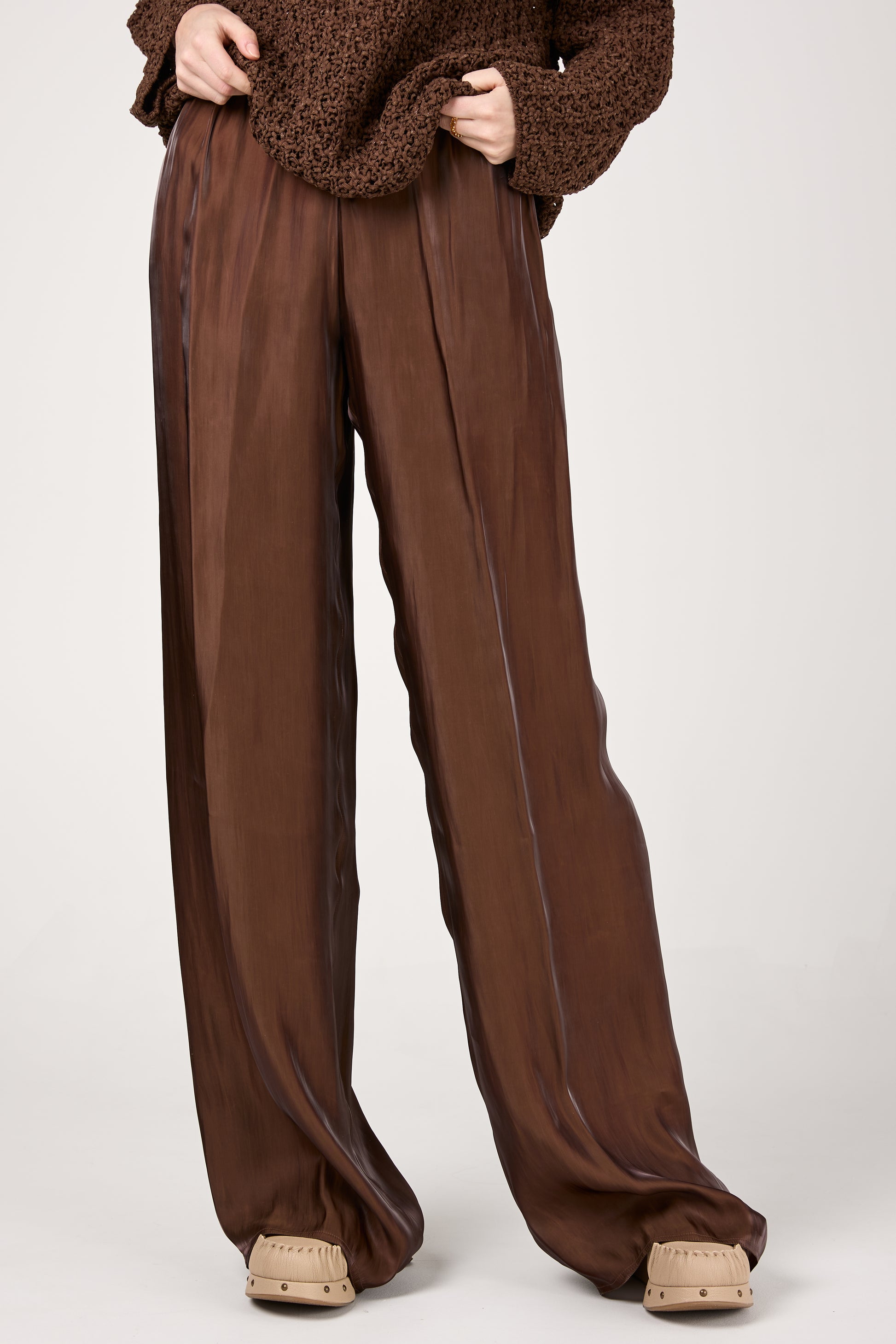 GENTRYPORTOFINO Fluid Iridescent Pant in Marone. Timeless wardrobe essential, expertly crafted in Italy from a lustrous, lightweight fabric . Designed with a wide-leg silhouette, these trousers drape beautifully, exuding effortless sophistication. The relaxed fit and elasticized waistband ensure both comfort and style.
